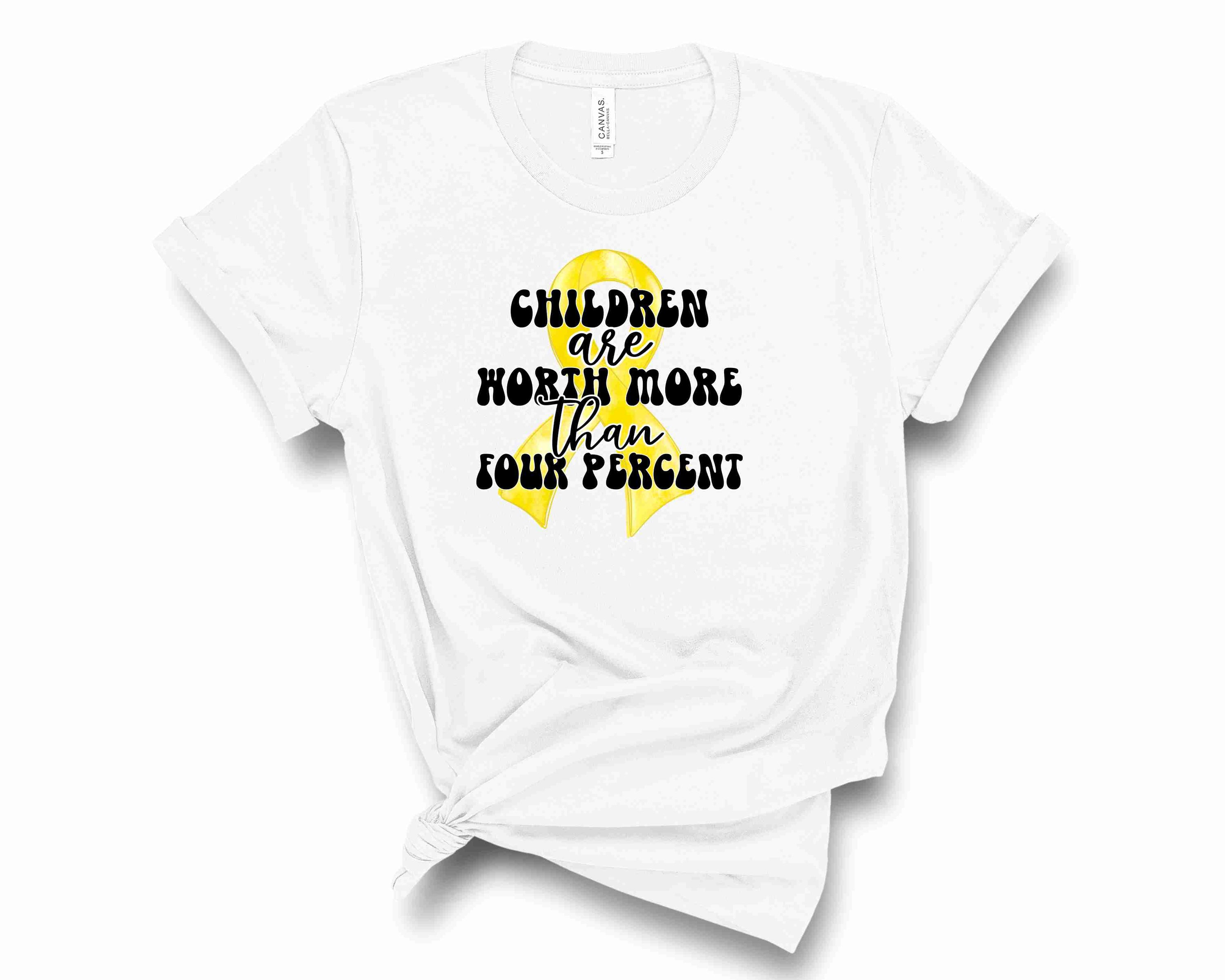 The eye-catching graphic on the front of the tee boldly states, 'Children Are Worth More Than Four Percent.' This powerful message resonates with many and serves as a reminder of the importance of valuing our children and investing in their future. It's not just a t-shirt; it's a conversation starter that encourages awareness and advocacy.
