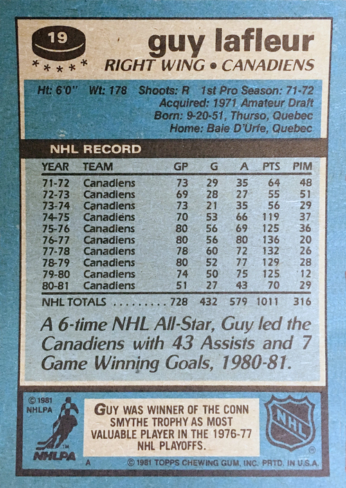 Collectible Trading Card featuring: Guy Lafleur from Montreal Canadiens. This piece of memorabilia measures 3.5 x 2.5 inches. Own this Piece of Hockey History!