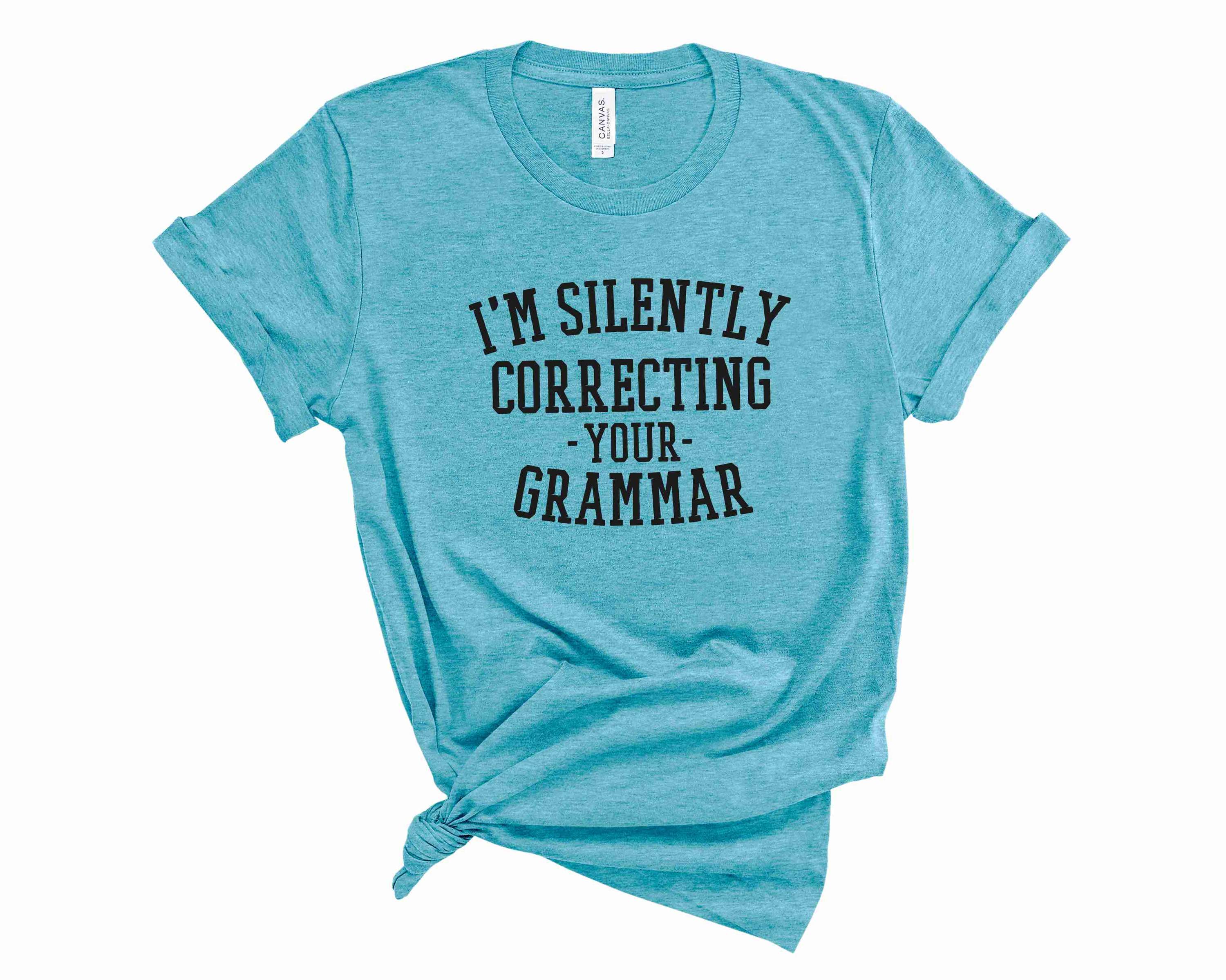 Introducing the 'I'm Silently Correcting Your Grammar' Graphic Tee, a must-have for anyone who appreciates the nuances of language and the art of grammar. This unisex t-shirt is designed to make a statement while providing ultimate comfort. Whether you're a teacher, a student, or simply a grammar enthusiast, this tee is perfect for you.