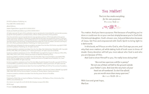 This delightful devotional, created just for the girls in your life, is a beautiful reminder of their purpose. . .their worth. . .their place in the world. 180 encouraging readings and inspiring prayers, rooted in biblical truth, will reassure a girl's doubting heart.