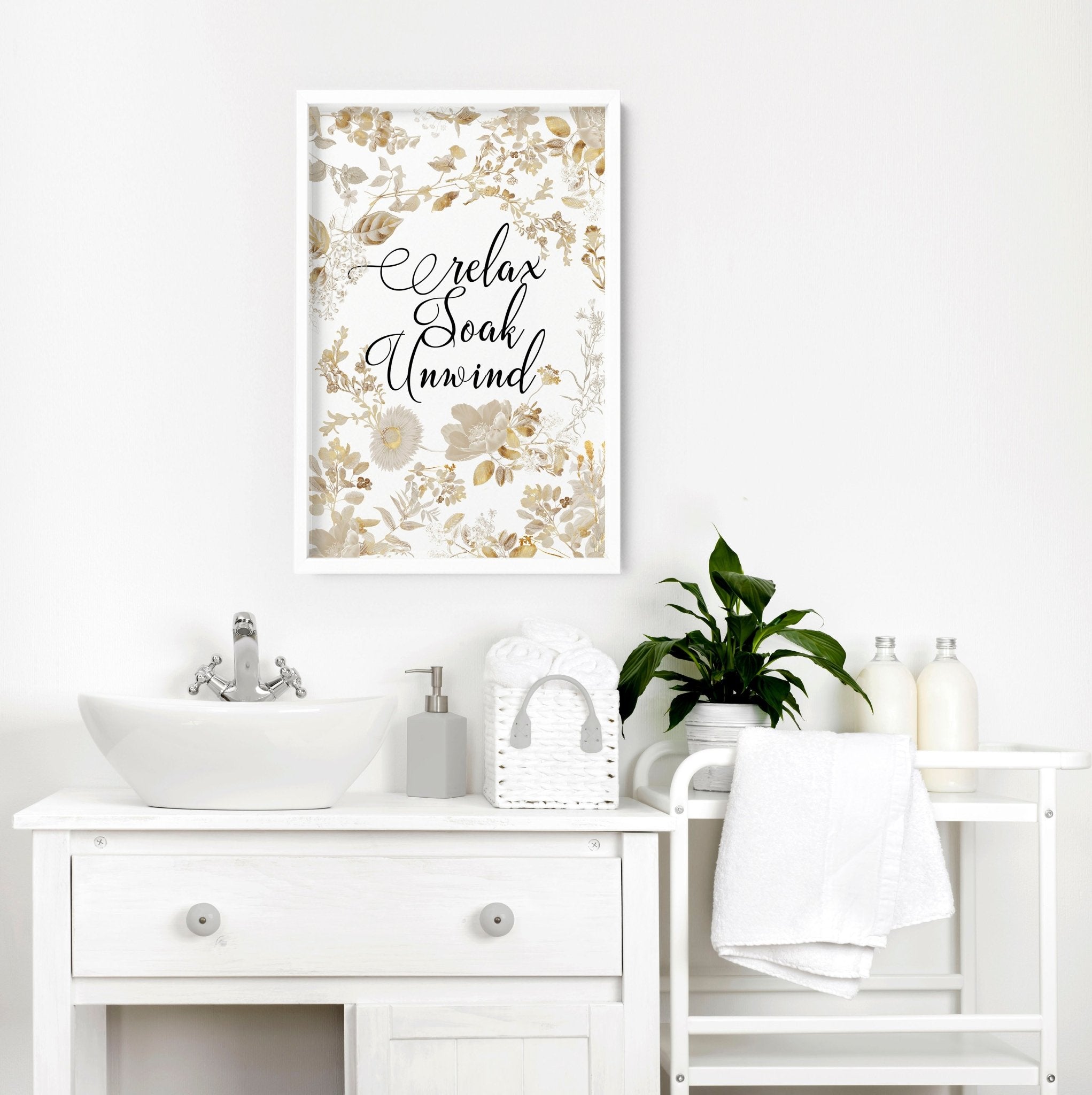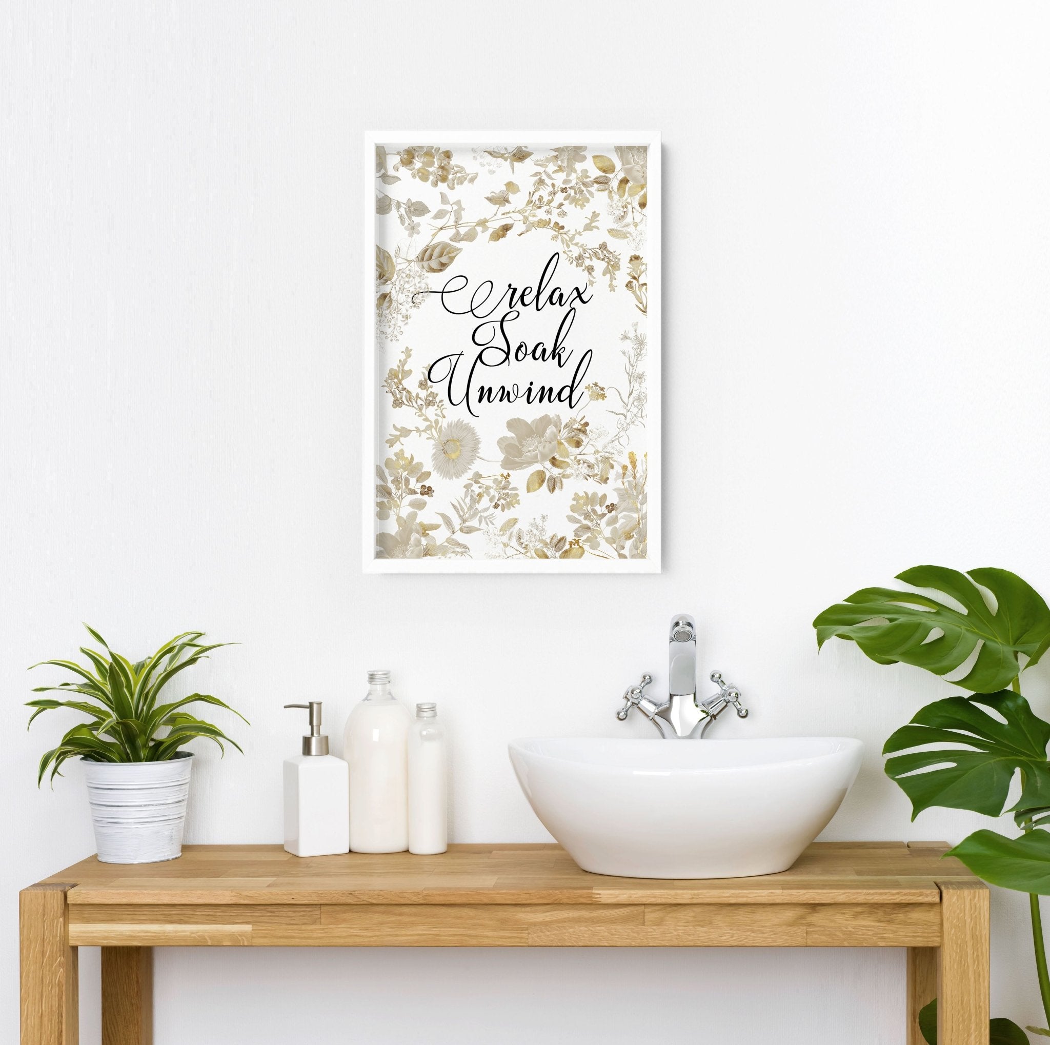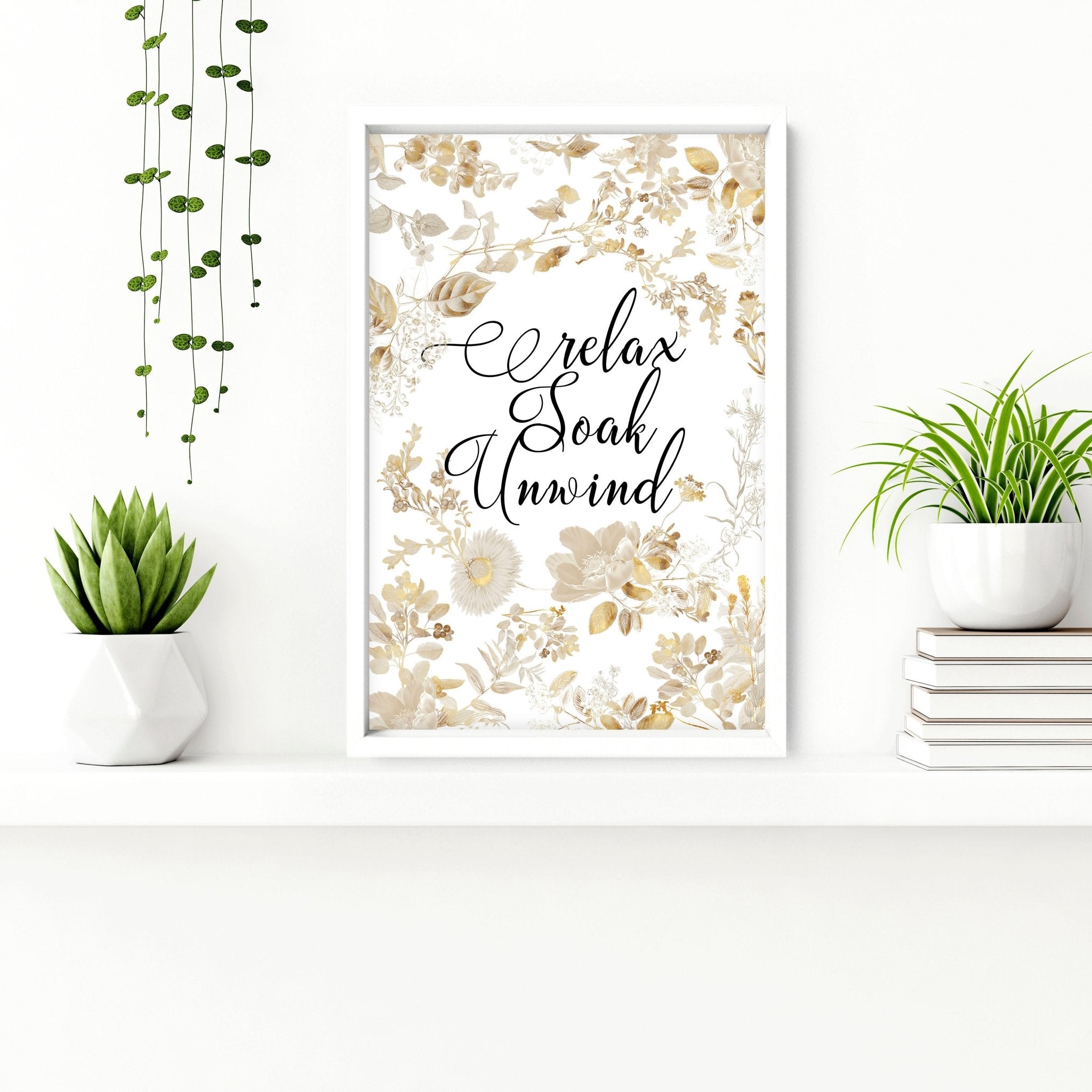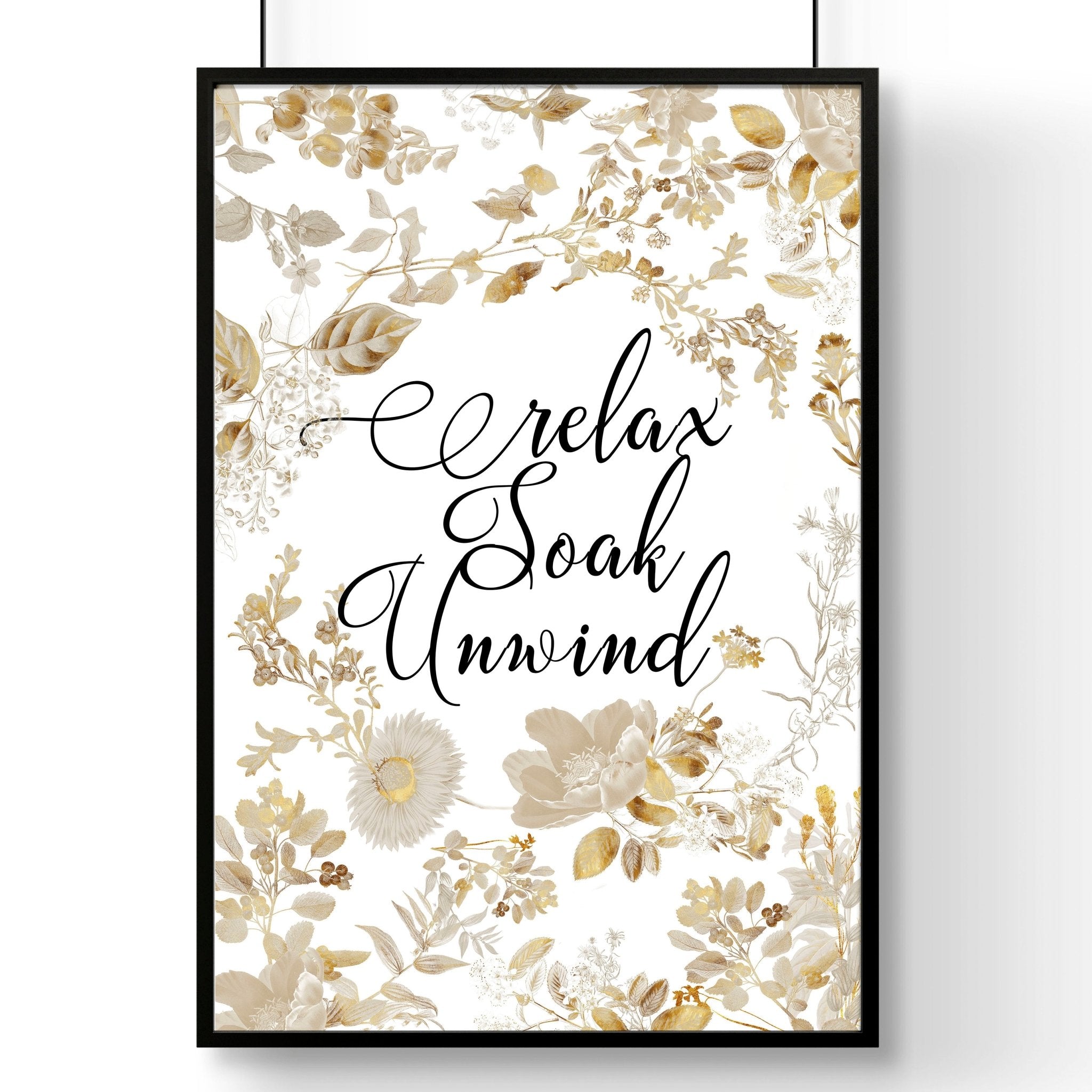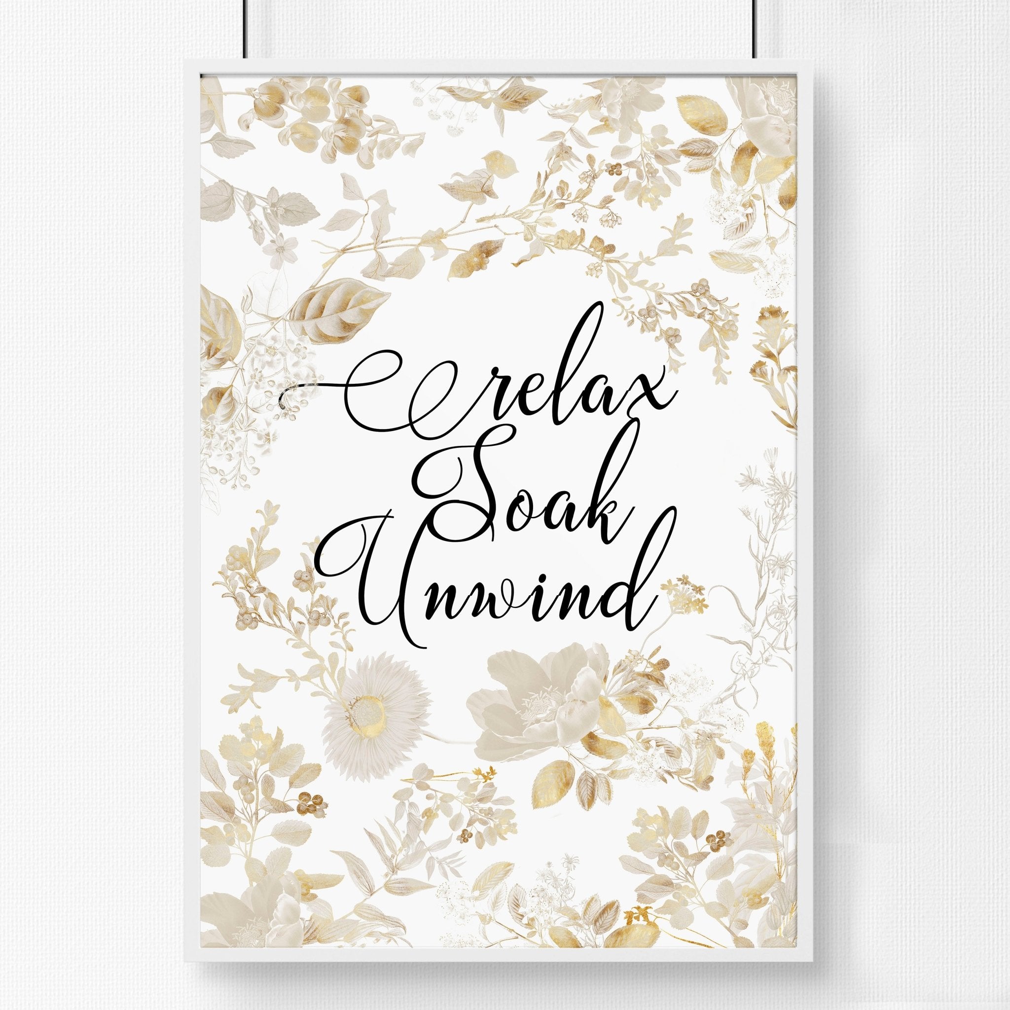 Elevate your bathroom walls with the serene charm of our Gold Botanicals Relax Soak Unwind quote art print, and immerse yourself in the exquisite beauty of its golden botanical details. Embrace the luxurious feel and create a soothing sanctuary where you can indeed unwind and rejuvenate.