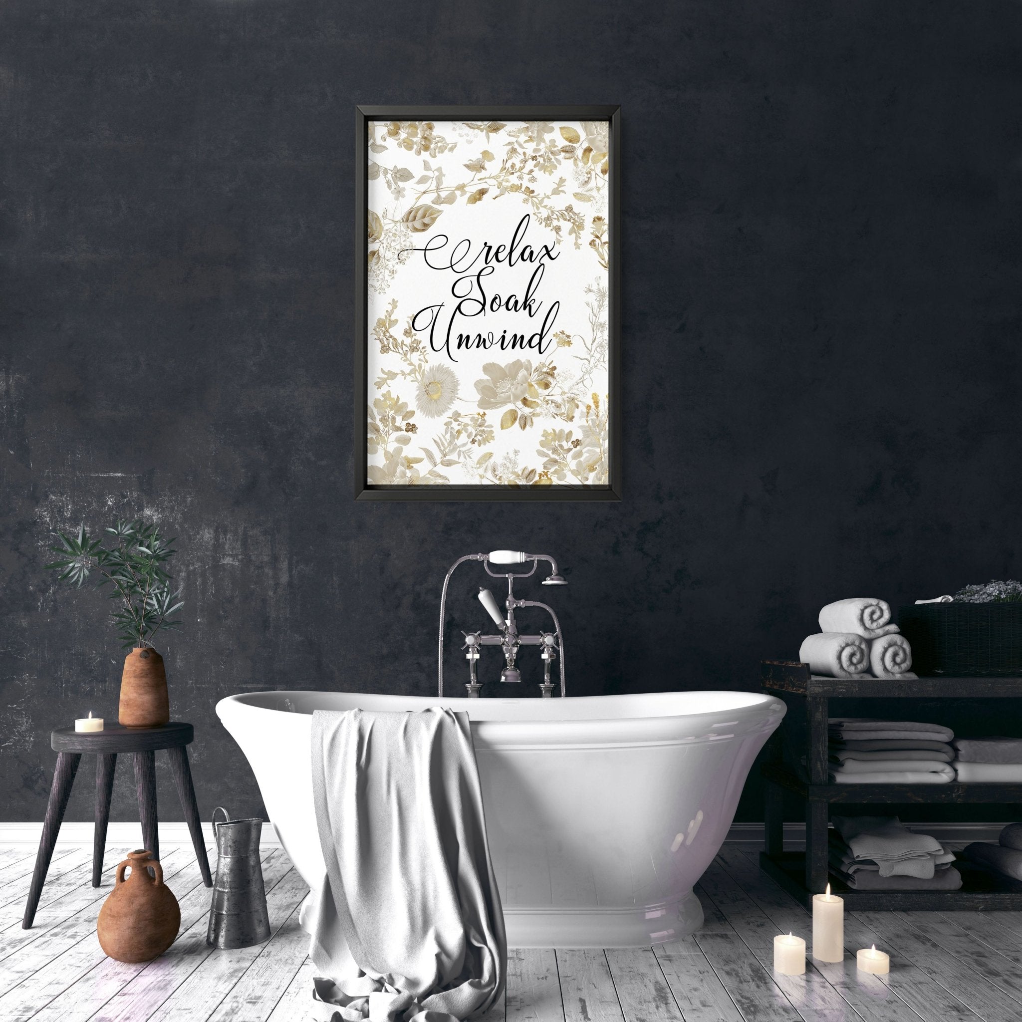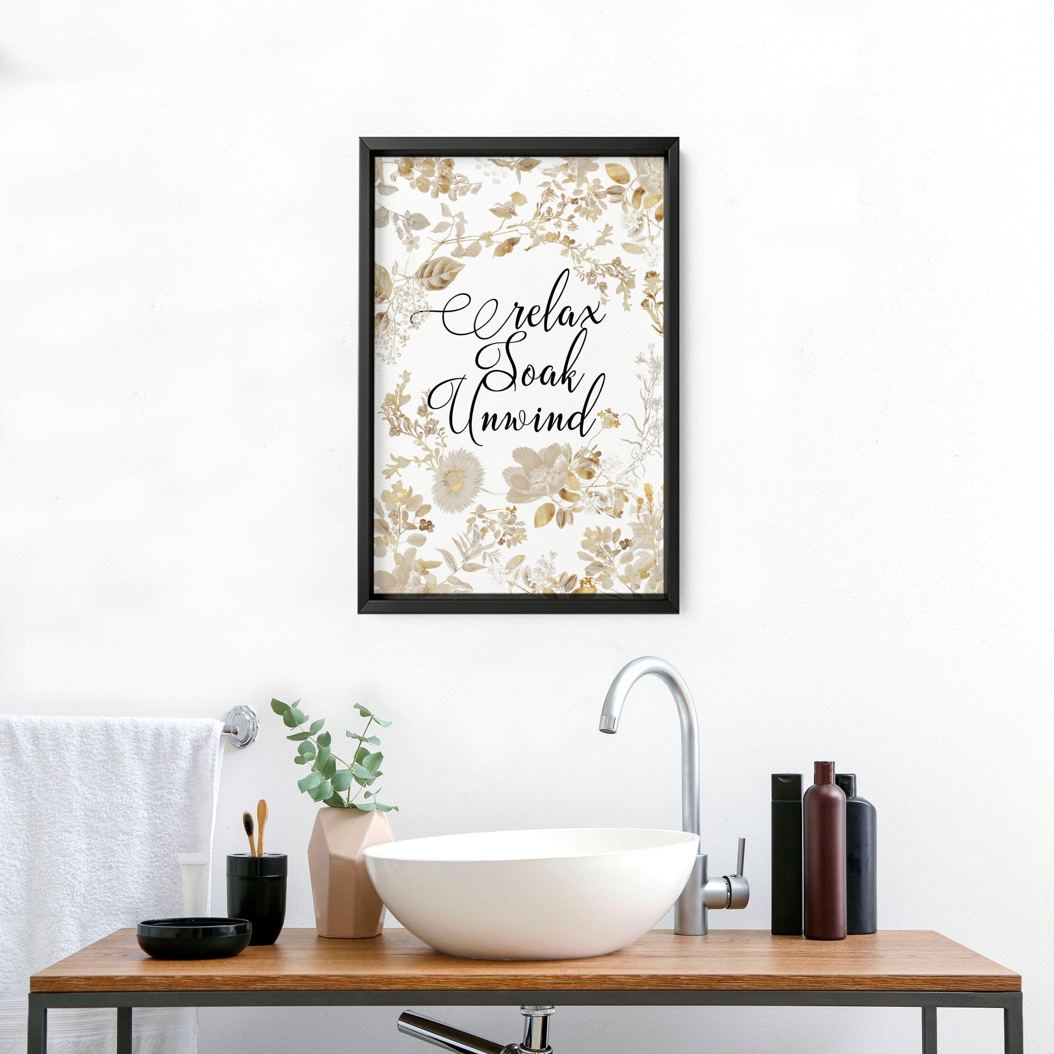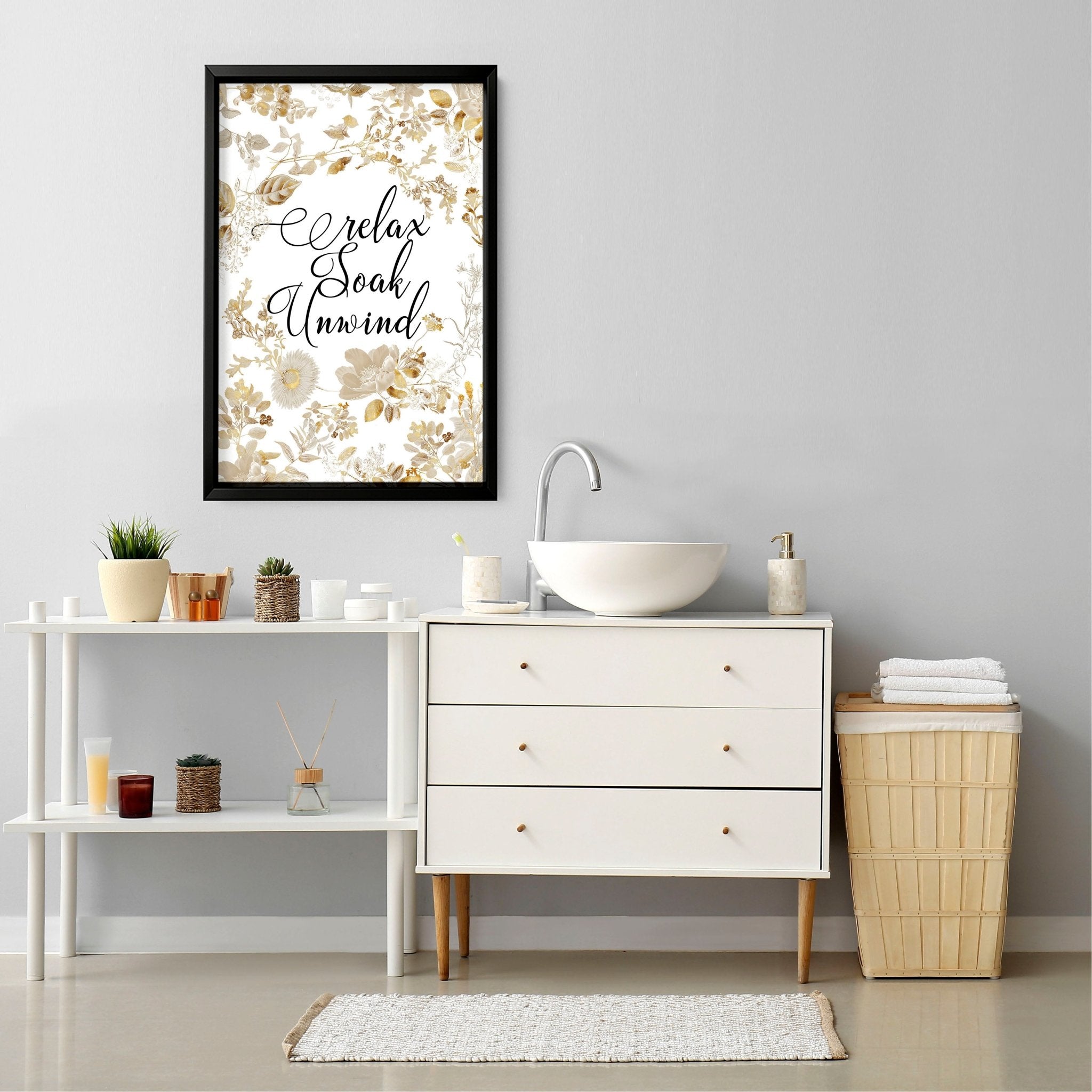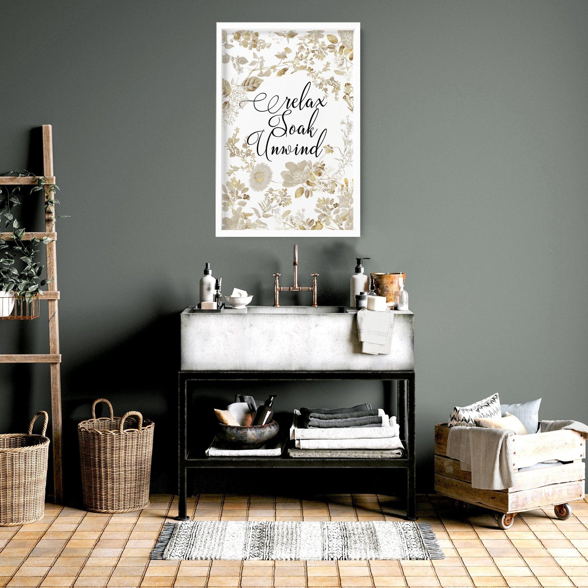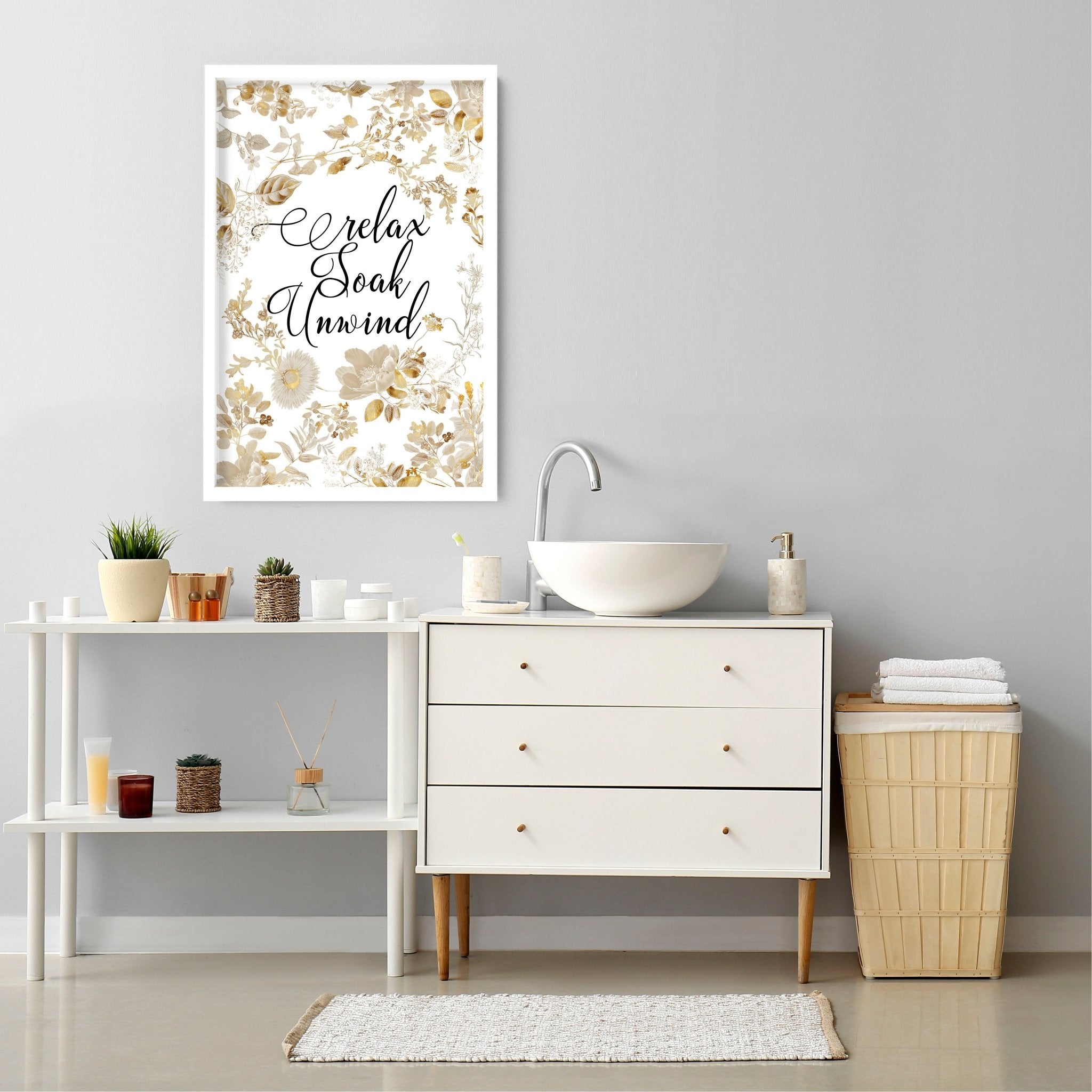 Elevate your bathroom walls with the serene charm of our Gold Botanicals Relax Soak Unwind quote art print, and immerse yourself in the exquisite beauty of its golden botanical details. Embrace the luxurious feel and create a soothing sanctuary where you can indeed unwind and rejuvenate.