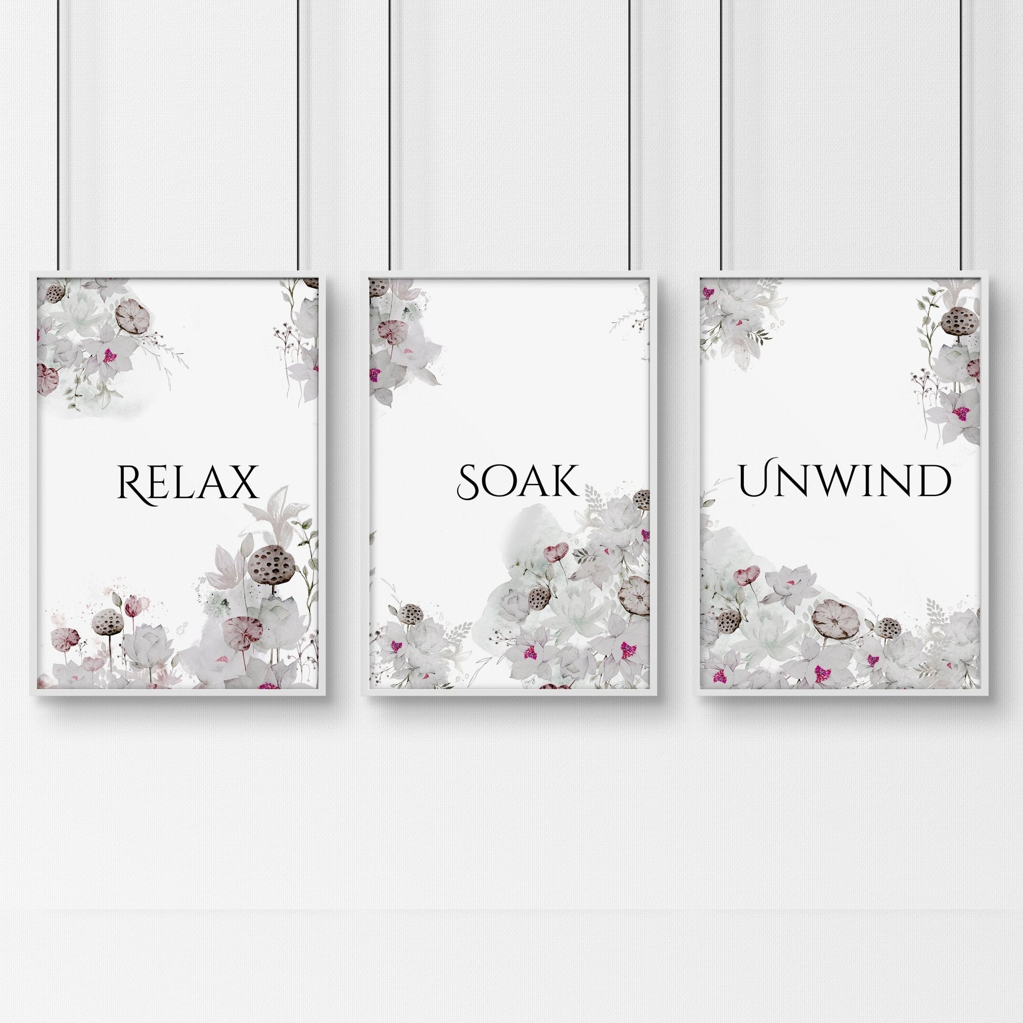 The smooth grey and magenta color palette of our wall prints adds a lovely touch of color to any room. These colors are not only trendy but also versatile, allowing them to complement various bathroom styles and color schemes. Whether your bathroom features neutral tones or bold accents, our prints will enhance the overall aesthetic and create a cohesive look.
