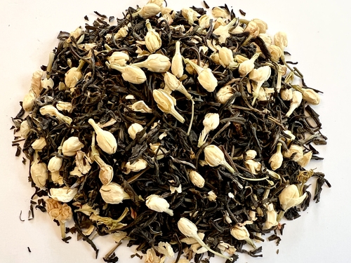 * JASMINE GREEN TEA- whole leaf green tea is layered with jasmine blossoms for a delicate floral taste with a hint of sweet jasmine; green tea.