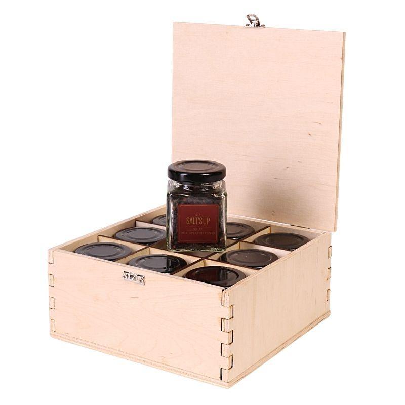Introducing the exquisite Wooden Gift Box with 9 Gourmet Salts and Peppers, a perfect present for culinary enthusiasts and food lovers alike. This beautifully crafted wooden box not only serves as a stunning gift but also as a reusable storage solution for your favorite seasonings. Each box is filled with a carefully curated selection of high-quality salts and peppers that will elevate any dish.