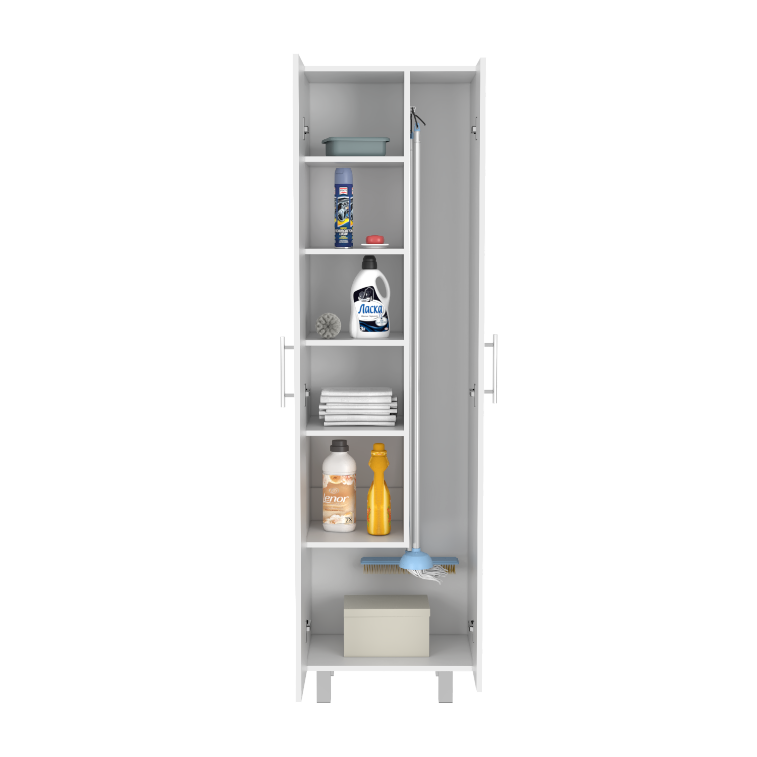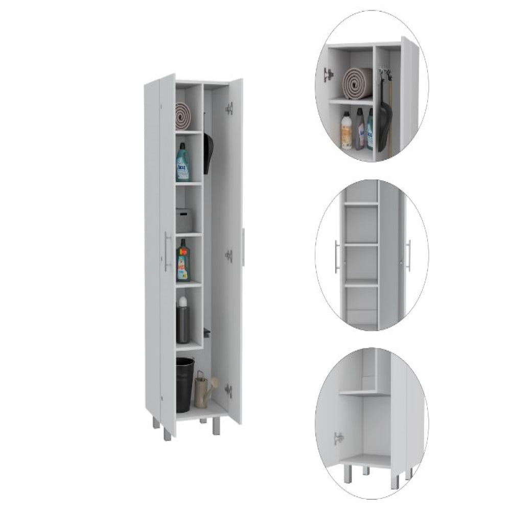This pantry features five shelves, allowing you to store everything from kitchen accessories to cleaning products efficiently. The shelves are designed in various sizes, ensuring that you can safely store items of different dimensions. The right side of the pantry offers additional space for toiletries, making it a versatile addition to your home.