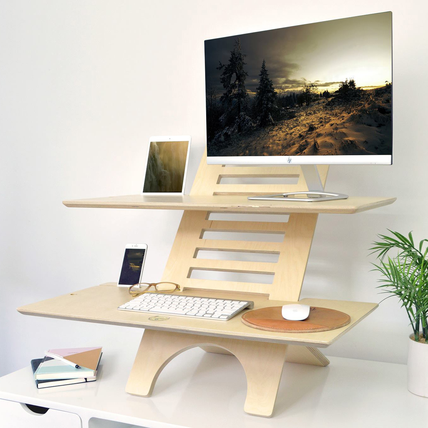 Constructed from premium 3/4” Baltic Birch plywood, the JUMBO DeskStand is incredibly strong and can support a weight of up to 35lb per shelf. With a total weight of 26lb, it is sturdy yet lightweight enough for easy relocation. The top shelf can accommodate two 21.5” screens or a laptop and monitor, while the bottom shelf is perfect for your keyboard and mouse.