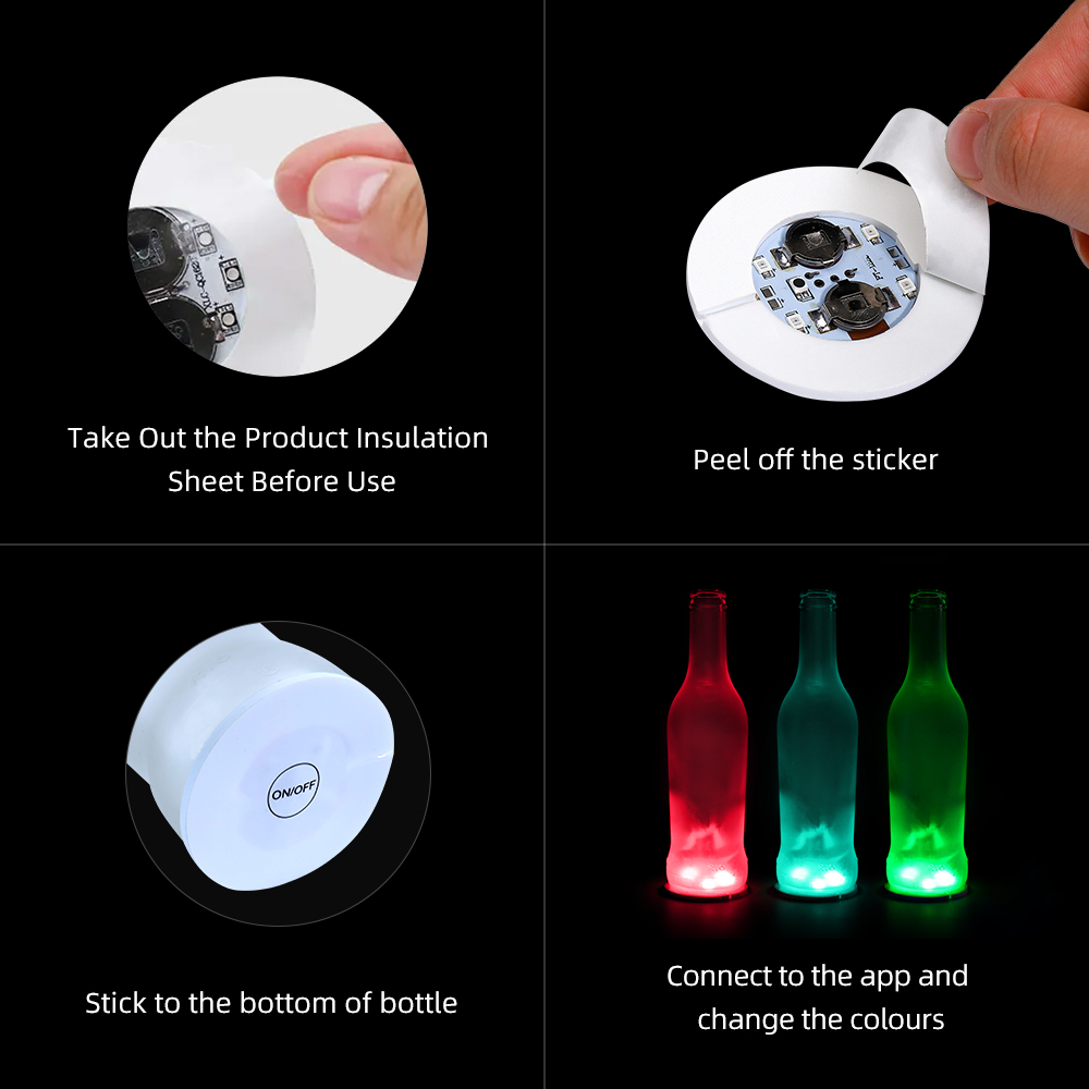 Applying the LED Bottle Coaster Stickers is a breeze. Simply peel off the adhesive backing and stick them onto your bottles. The lightweight design ensures that they won't affect the stability of your drinks. With just a press of a button, you can switch them on and off, making them user-friendly for all ages.