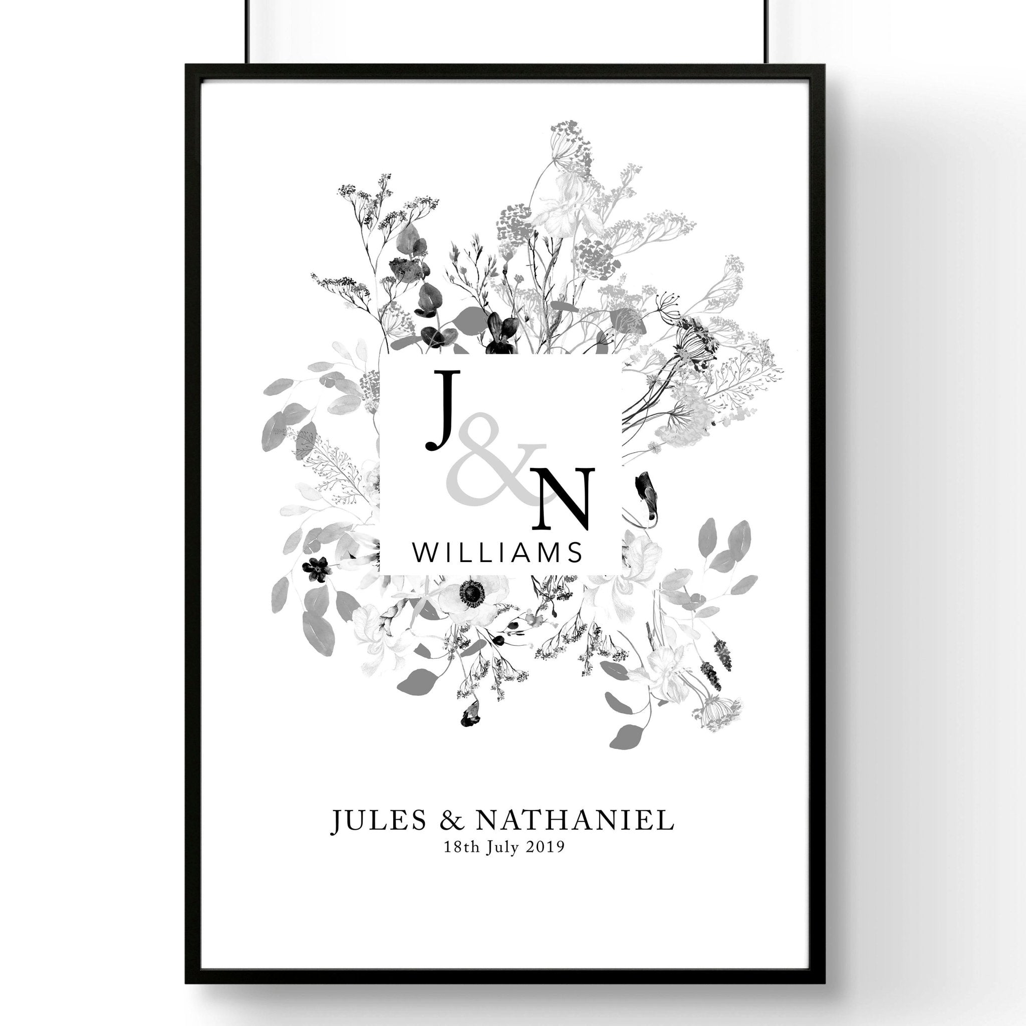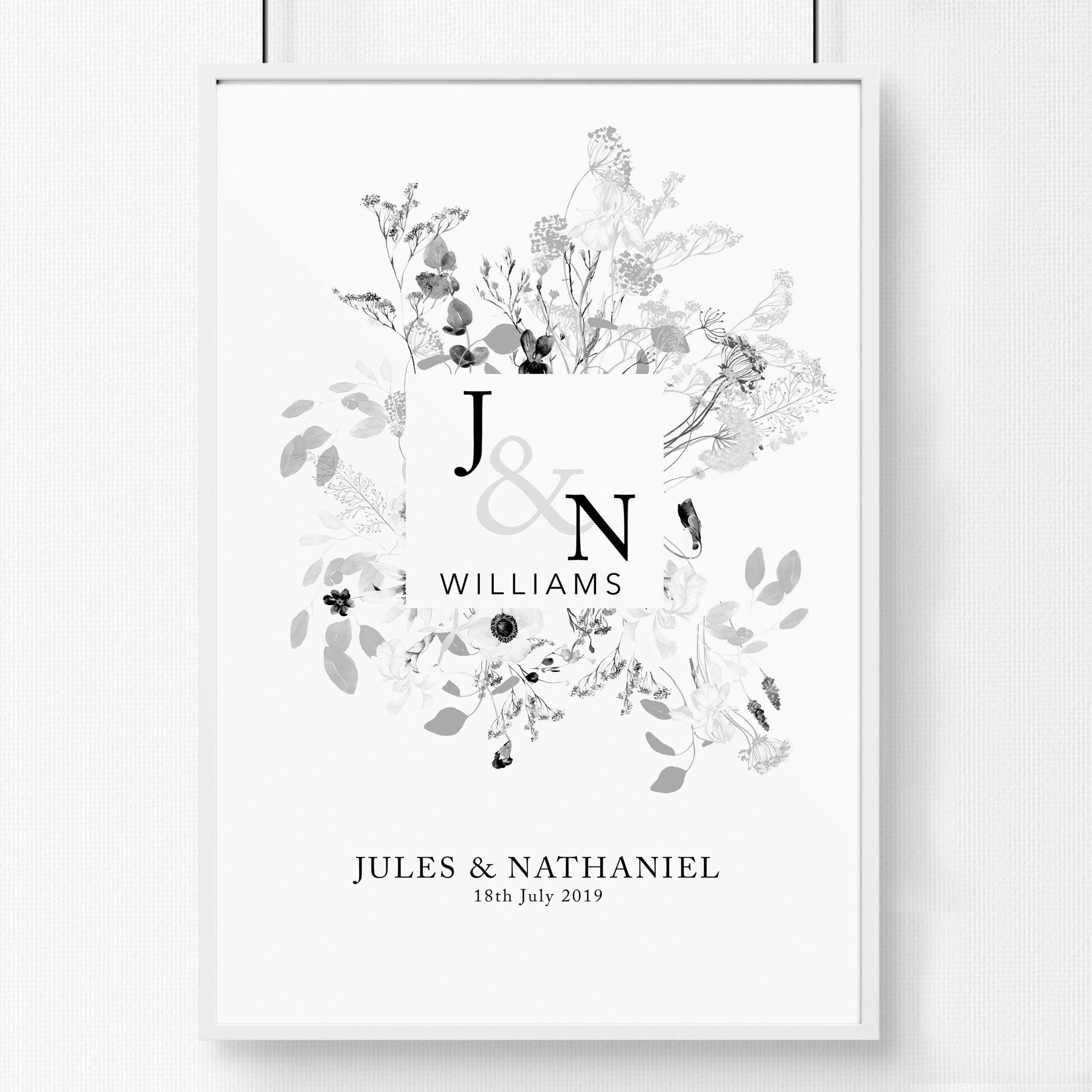 Crafted with meticulous attention to detail, this wall art print captures the essence of elegance and sentimental value. The botanical elements incorporated into the design add a touch of natural beauty, symbolising growth and the enduring bond of your love. The neutral grey colours create a timeless and sophisticated aesthetic, making it a perfect addition to any home decor.
