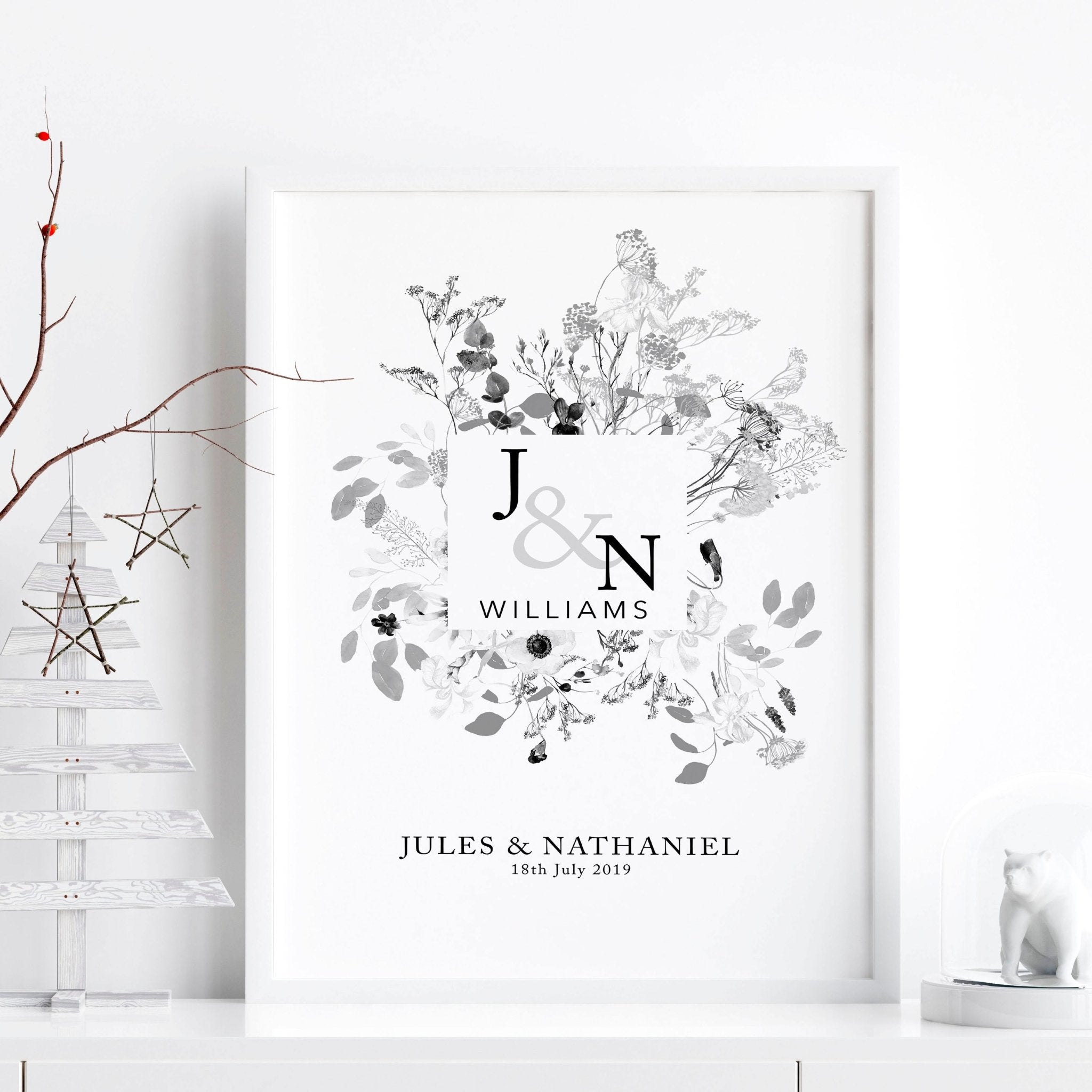 Celebrate the joyous milestone of your wedding anniversary with our exquisite Personalised Wedding Anniversary Gifts. This stunning wall art print features a unique Botanical Monogram design in neutral grey colours, beautifully adorned with your customised names and anniversary details. It is not just a piece of art; it is a heartfelt reminder of your love and commitment, making it a perfect gift for any couple celebrating their special day.