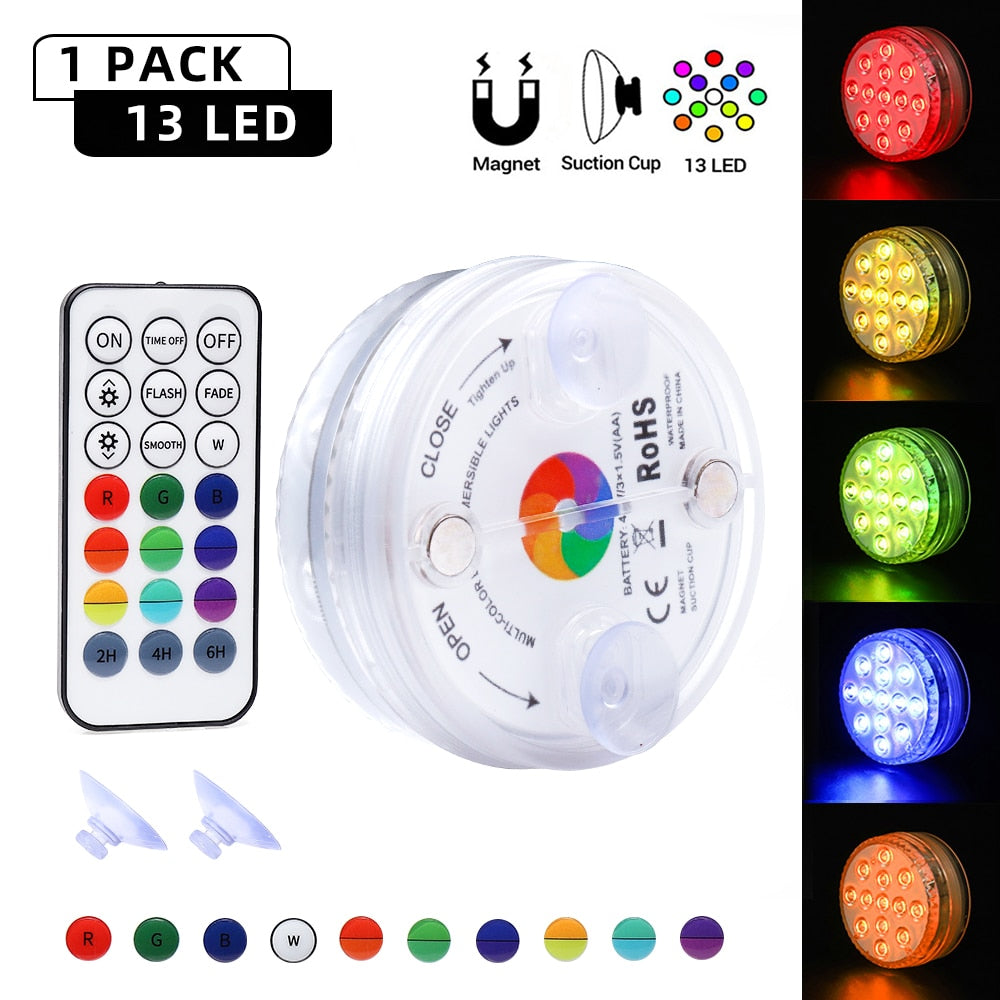 Transform your outdoor space with our Submersible 13 LED Underwater Pool Lights. Designed for both beauty and functionality, these lights are perfect for enhancing the ambiance of your pool, pond, or any water feature. With a robust suction cup for secure attachment, you can easily install these lights wherever you desire. The transparent shell allows the vibrant colors to shine through, creating a mesmerizing underwater display.