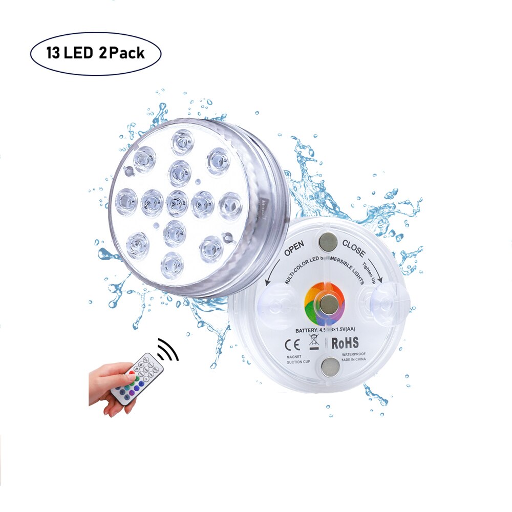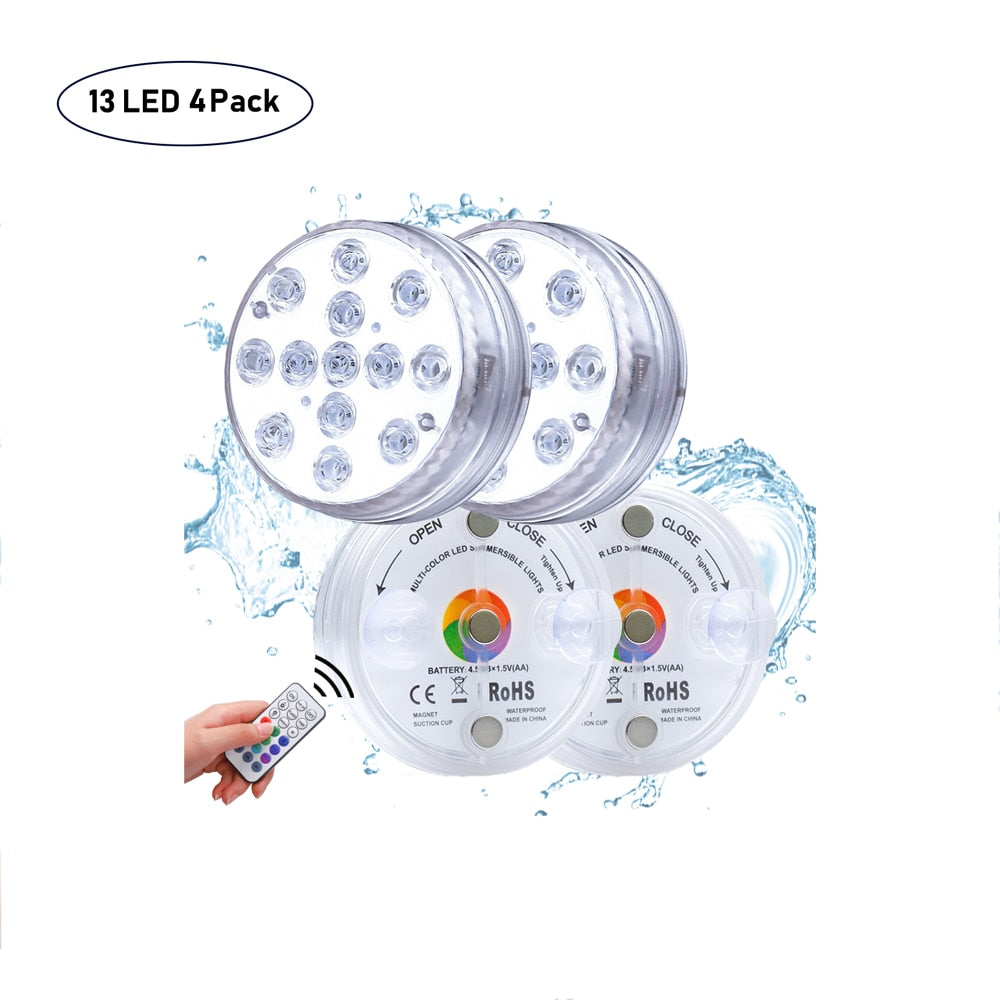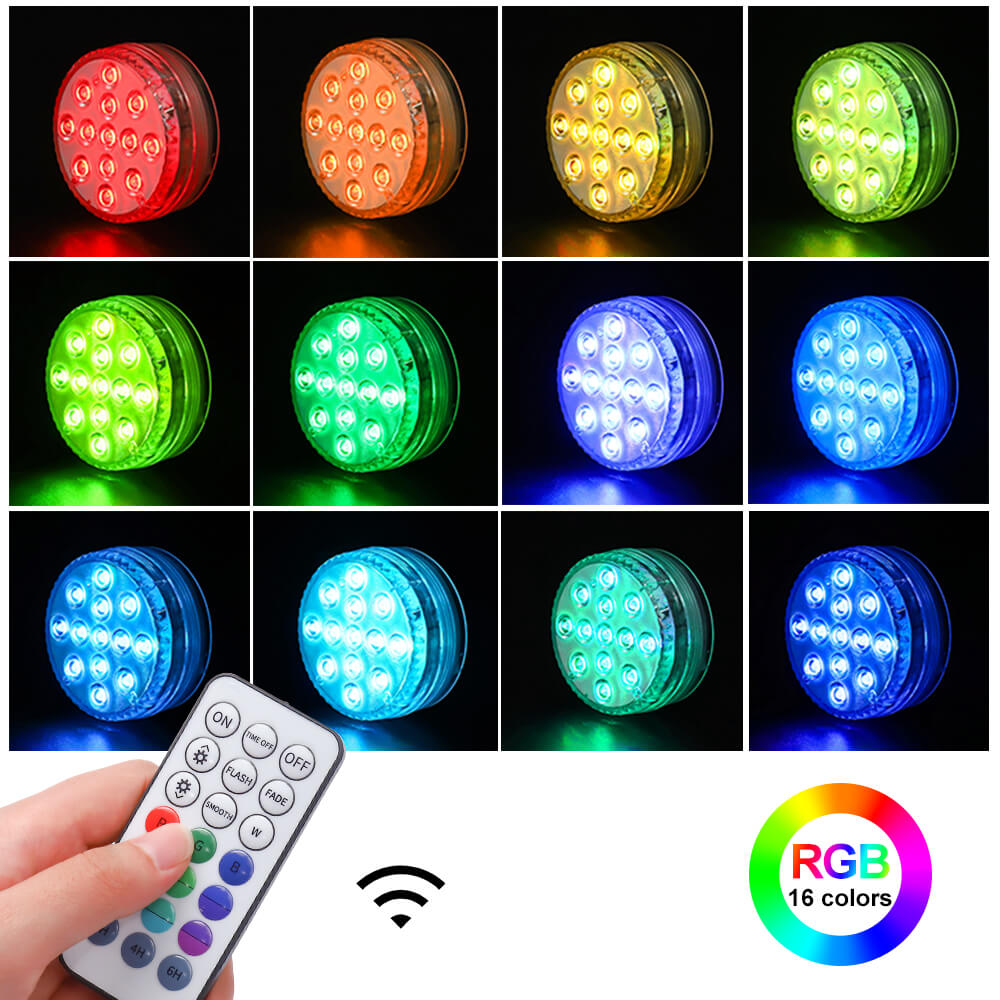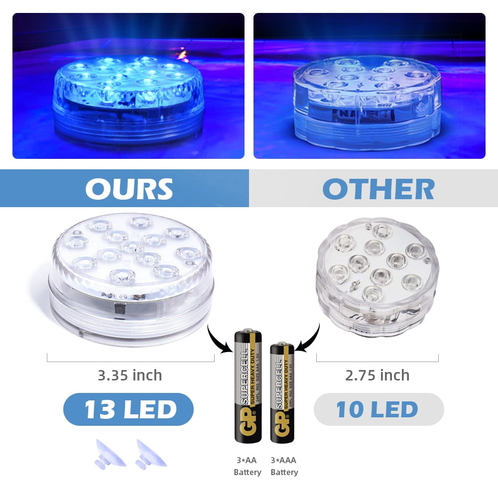 Our upgraded LED submersible lights come equipped with 13 powerful LEDs, providing a brightness that outshines traditional 10 LED models. With 16 different color options, you can customize the lighting to suit any occasion, whether it's a party, a romantic evening, or a relaxing night by the pool. The lights are powered by 3 AA batteries (not included), ensuring a long-lasting performance of up to 35-80 hours, depending on usage.