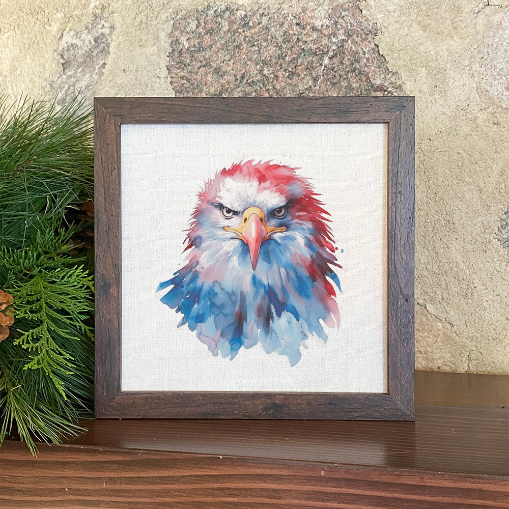 Introducing our stunning Watercolor Patriotic Eagle - Framed Sign, a perfect blend of artistry and patriotism. This beautifully crafted sign features a stylized eagle design that embodies the spirit of freedom and pride. Measuring 9" x 9" x 1.5", it is versatile enough to be displayed on a shelf or mantle, or hung on a wall to enhance your home decor.