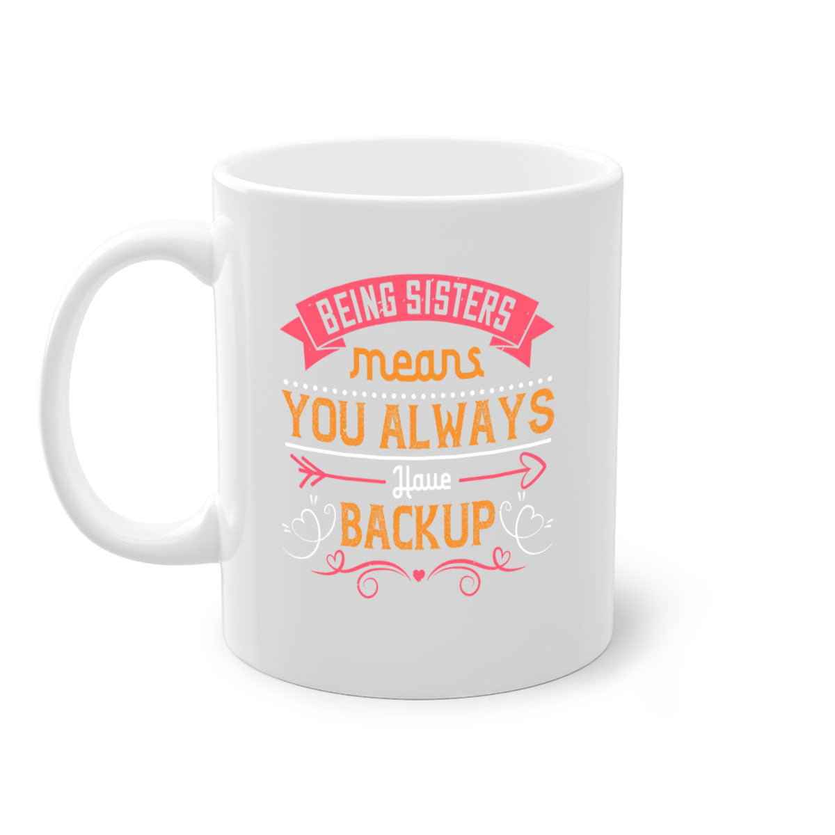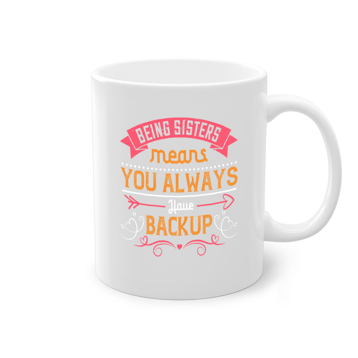 In summary, the 'Being Sisters Means You Always Have Backup' design mug is a stylish, durable, and versatile choice for anyone who values the bond of sisterhood. With its vibrant colors, comfortable handle, and high-quality ceramic material, it’s the perfect addition to your drinkware collection. Celebrate your sisterly bond with this beautiful mug today!