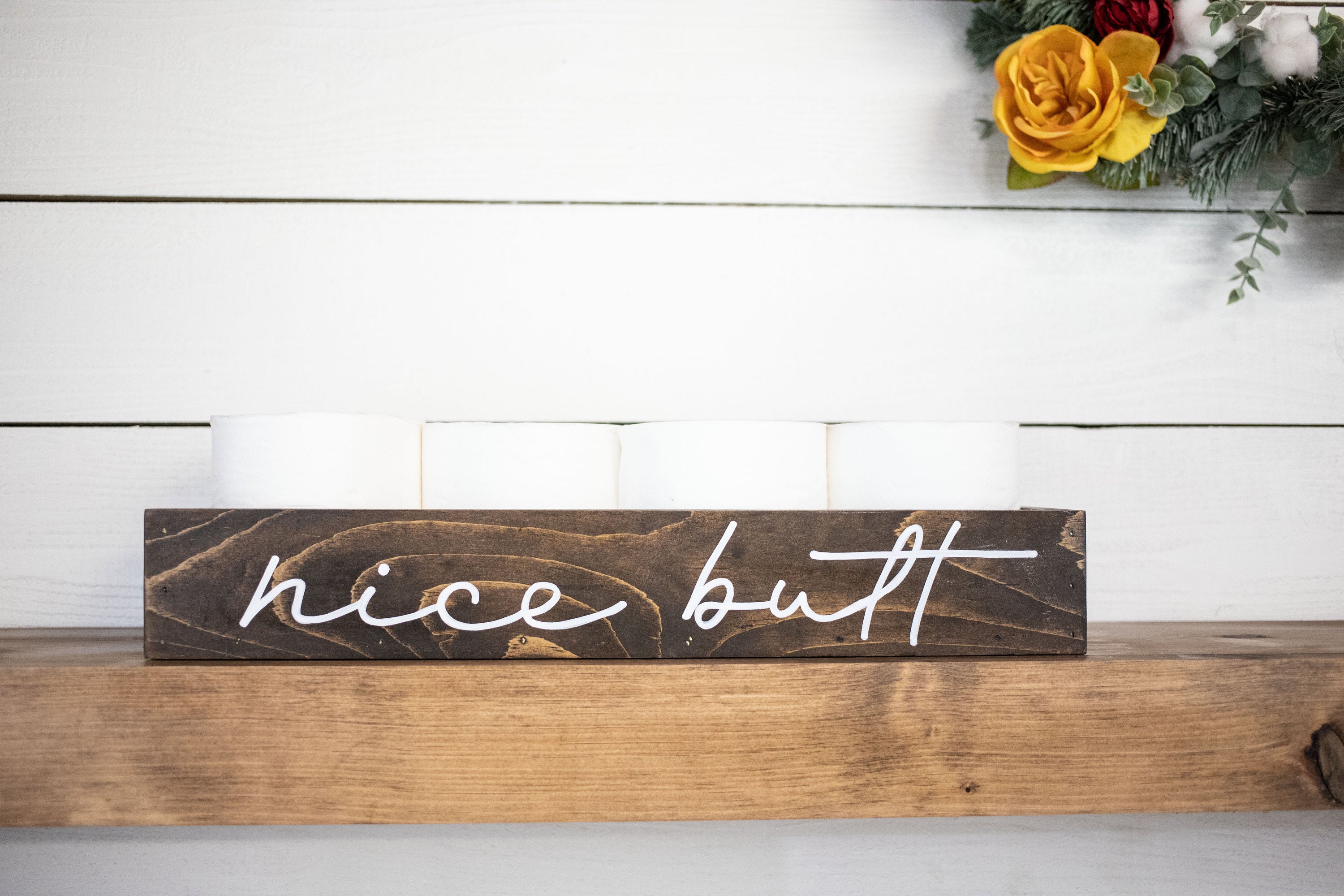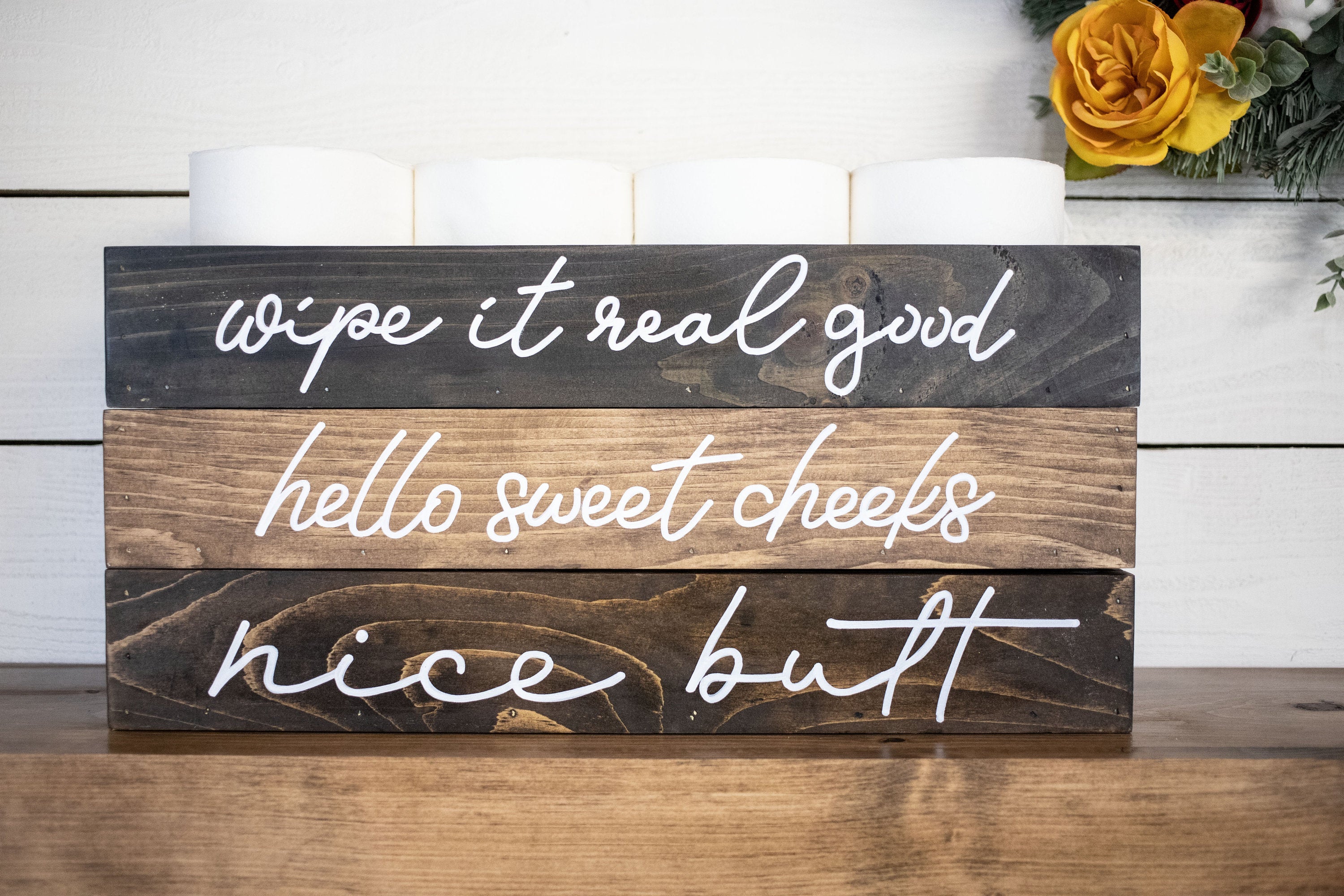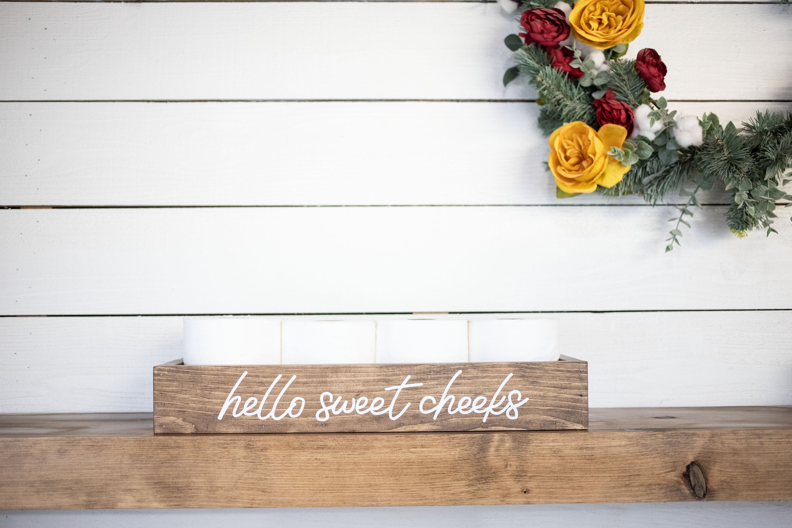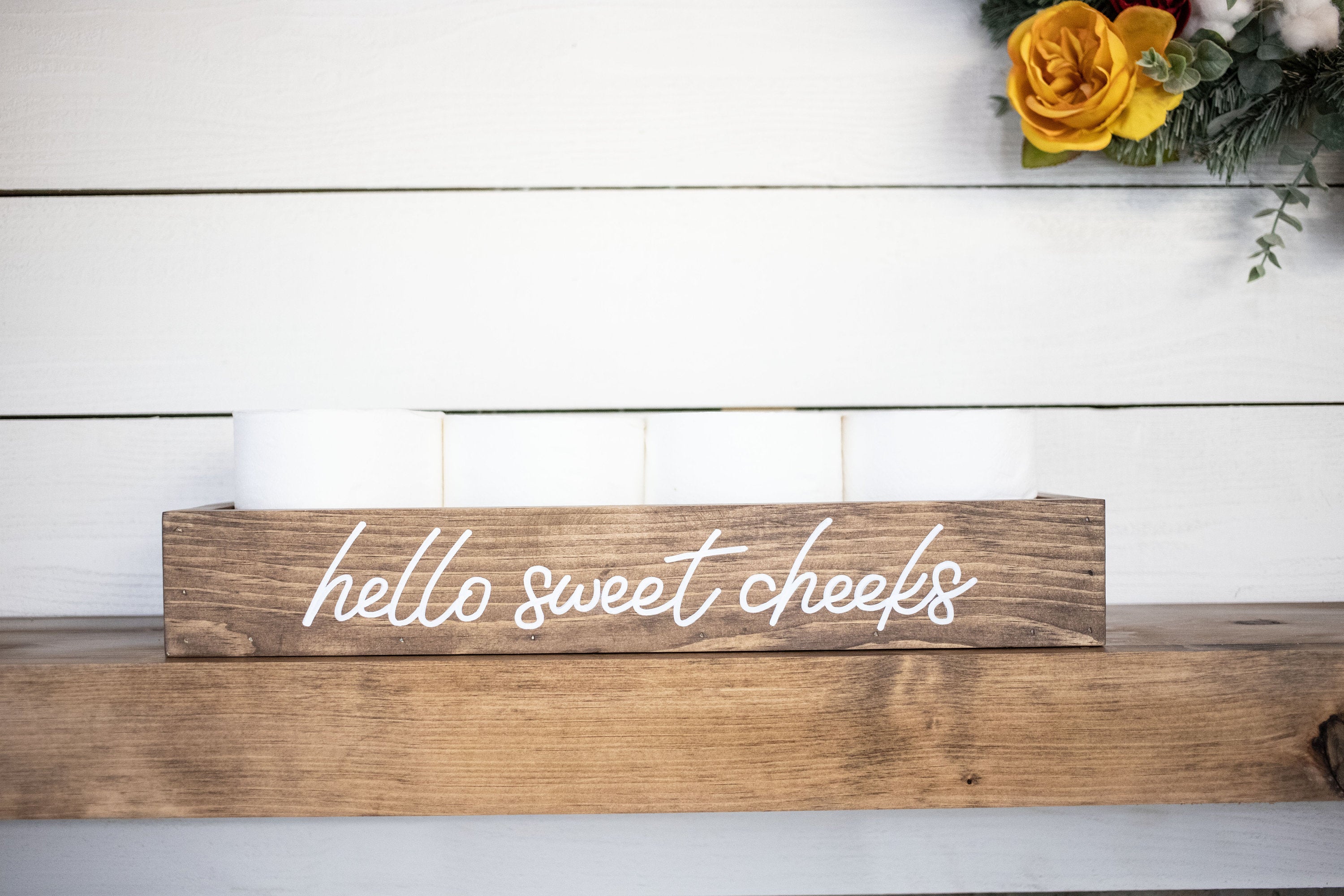 Please note that the Bathroom Storage Wood Box is not filled with items, and toilet paper is not included. The lettering is only on one side of the box, allowing you to choose how you want to display it. Due to the nature of wood, slight imperfections such as hairline cracks, small dents, or mineral streaks may be present. These features are a testament to the handcrafted quality of the product and should be embraced as part of its charm.