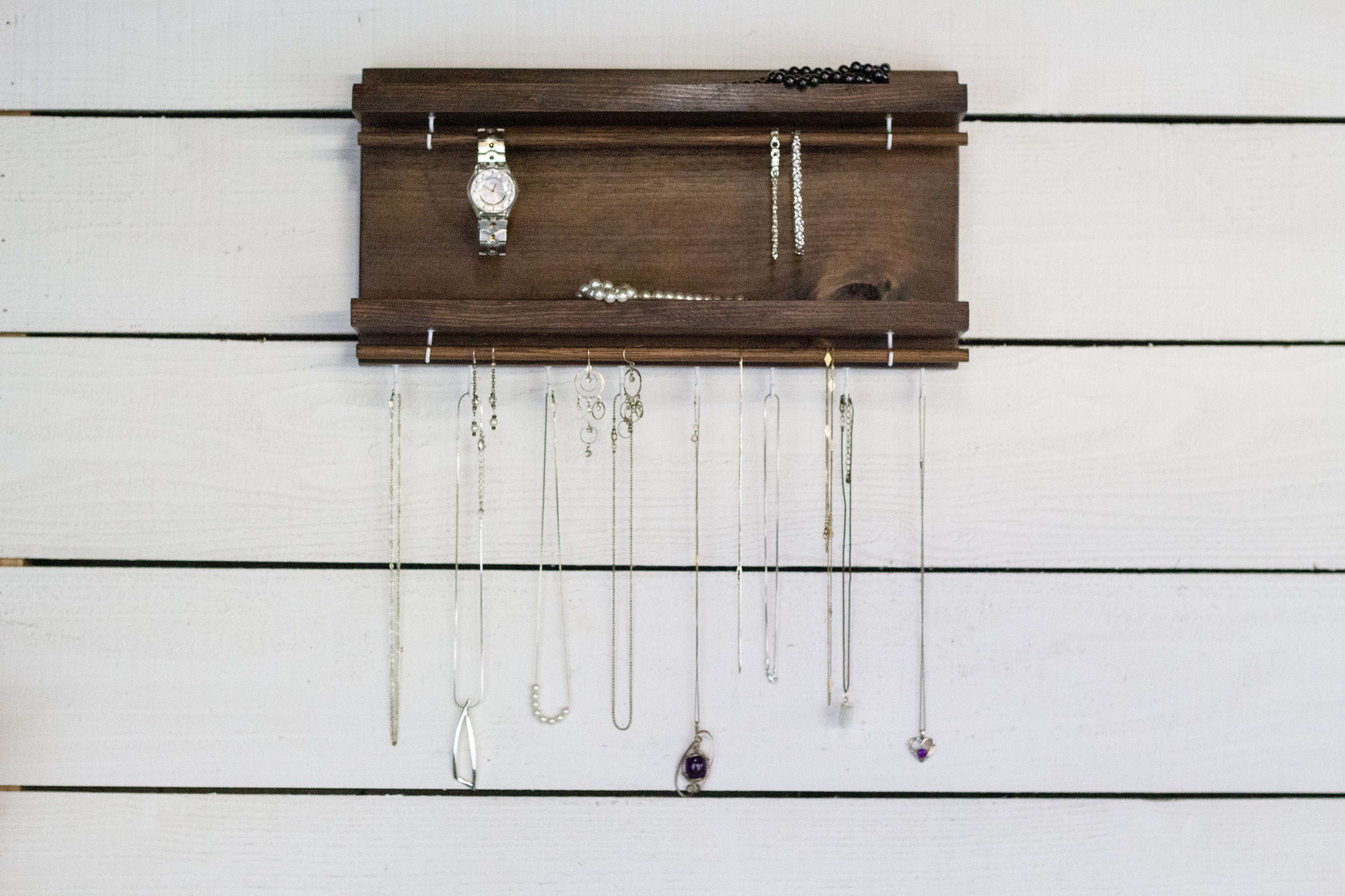 In summary, our Jewelry Holder with Two Shelves is the perfect solution for anyone looking to organize their jewelry collection in style. With its solid wood construction, functional design, and beautiful stain options, this holder is sure to enhance your space while keeping your accessories neatly arranged.