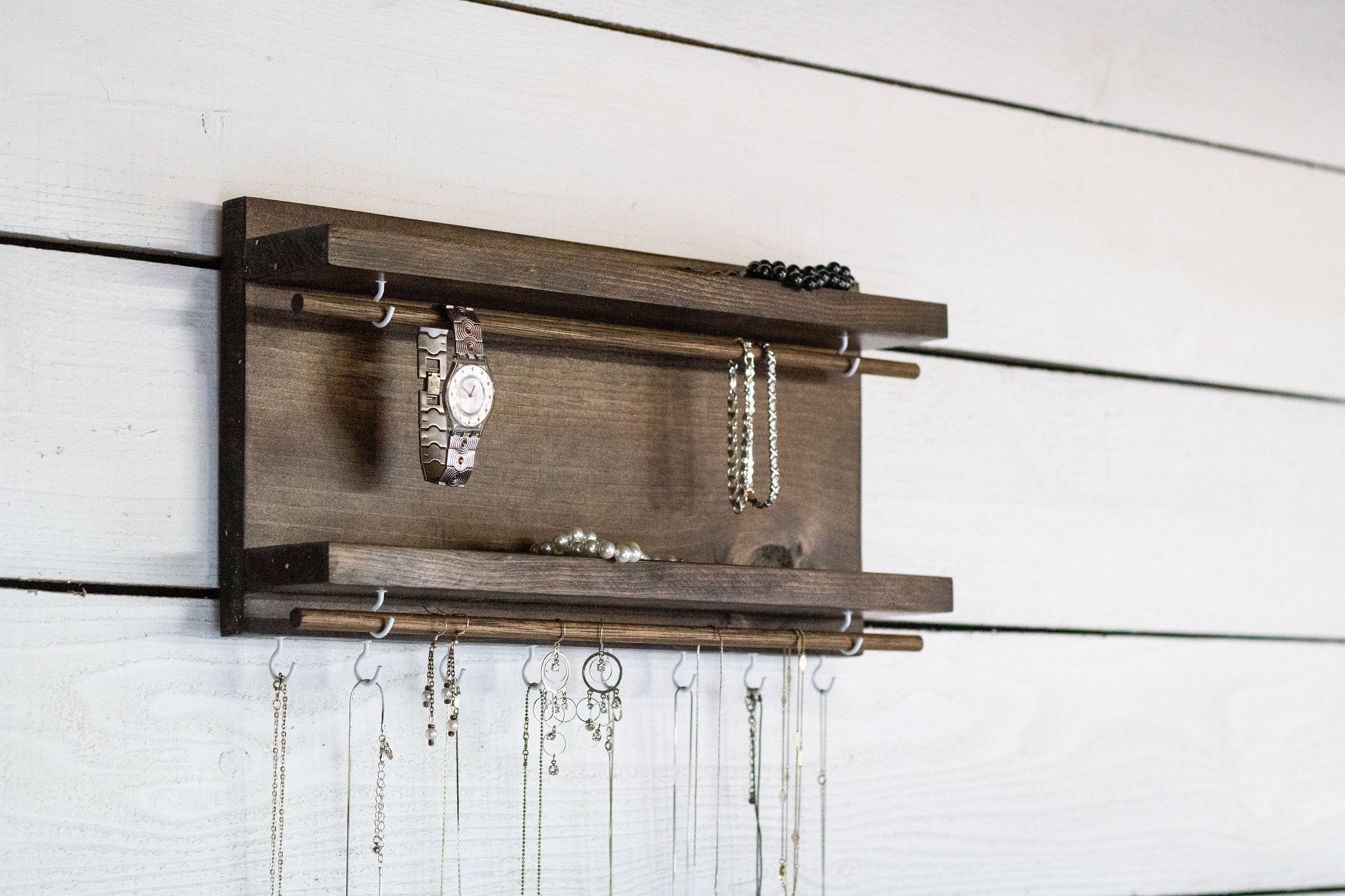 Please note that no jewelry is included with the purchase of the Jewelry Holder with Two Shelves. The natural variations in wood products, including color differences and minor imperfections, are part of what makes each piece unique. We encourage you to embrace these characteristics as they contribute to the overall beauty of your jewelry holder.