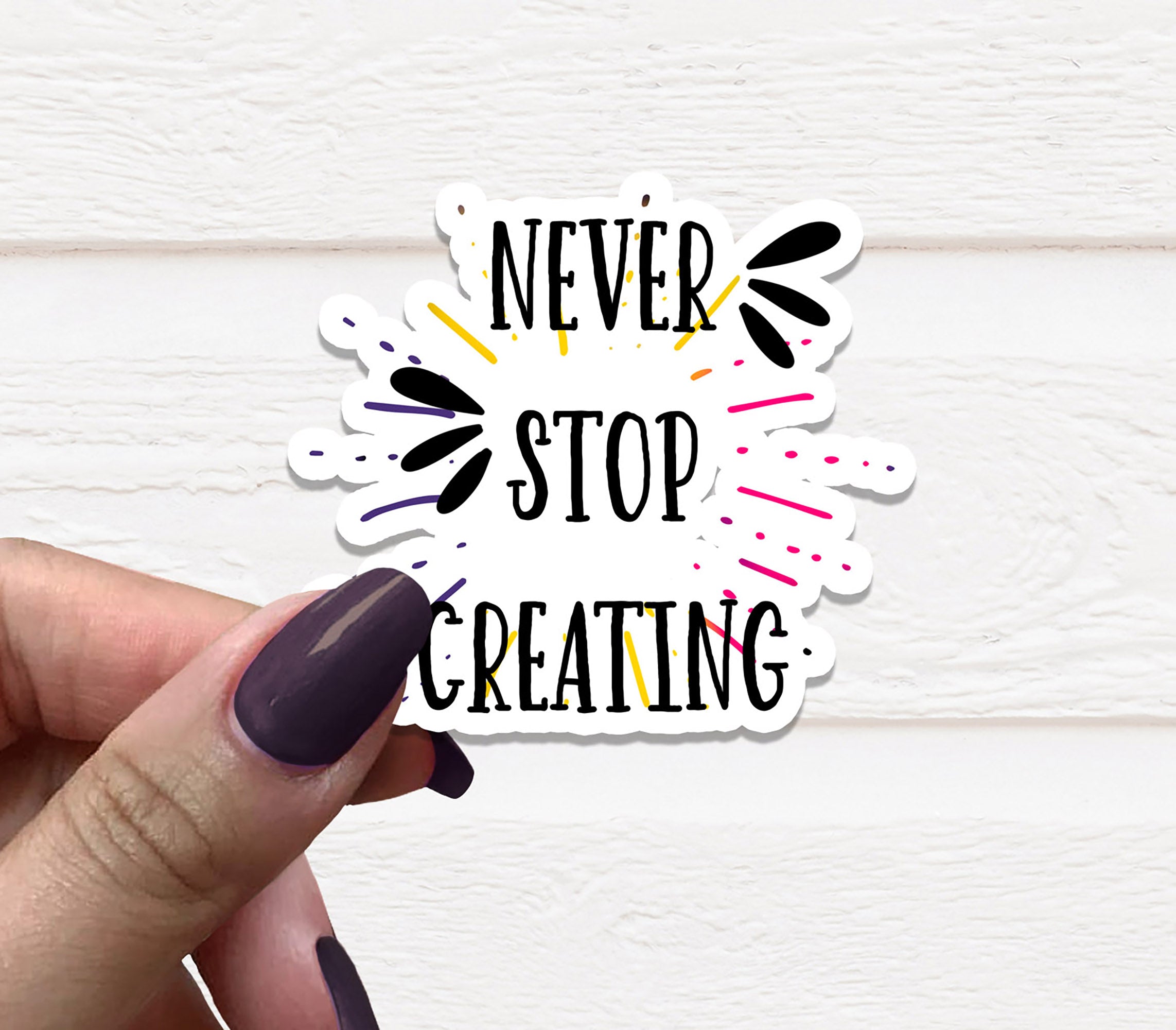 Never Stop Creating Vinyl Sticker on a white background, showcasing its matte finish and vibrant design.