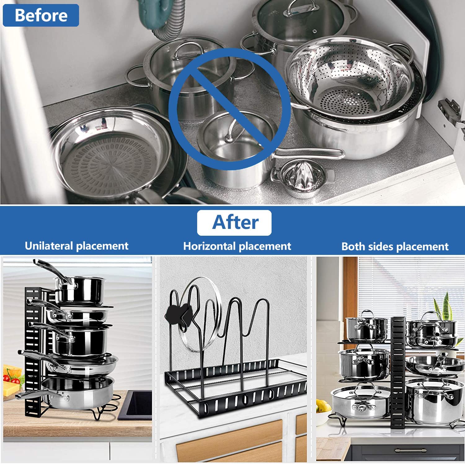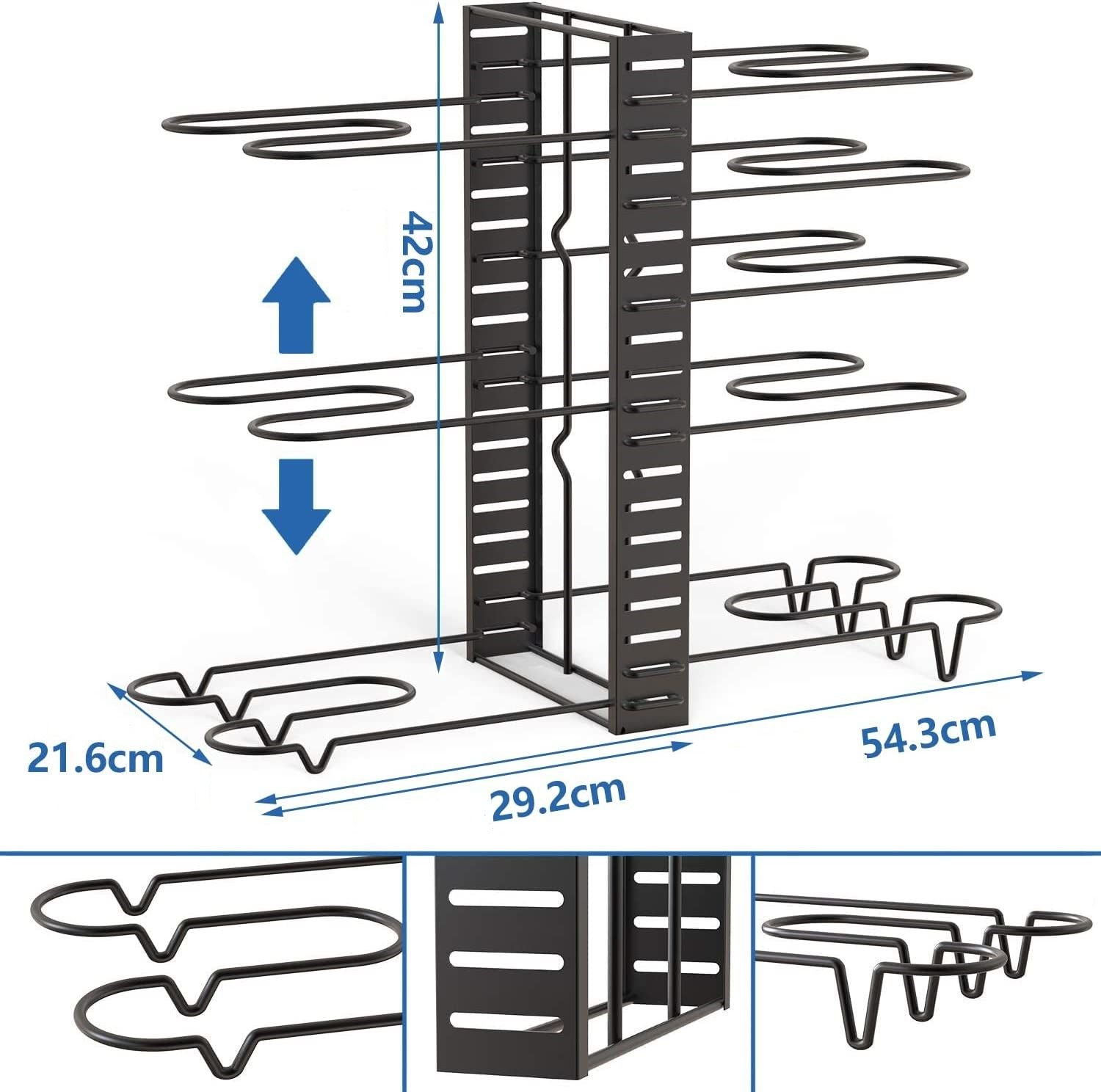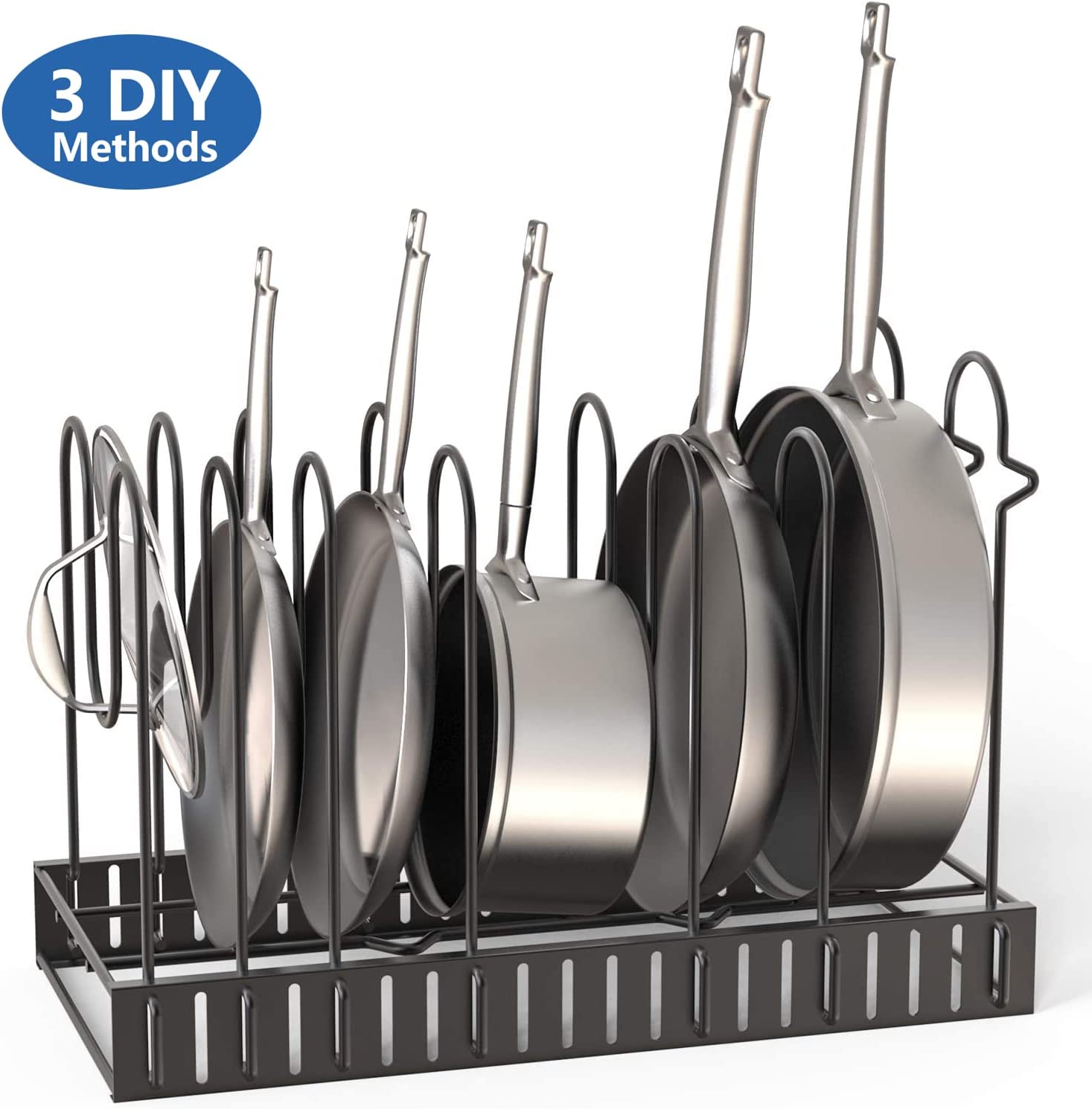 This adjustable pot holder can accommodate up to 9 frying pans, saucepans, griddles, or pots of various sizes. Whether you have a small kitchen or a large one, this organizer is a perfect solution for storing all your cookware. It helps you save valuable space in your cabinets and on your countertops, allowing for a more efficient cooking environment.