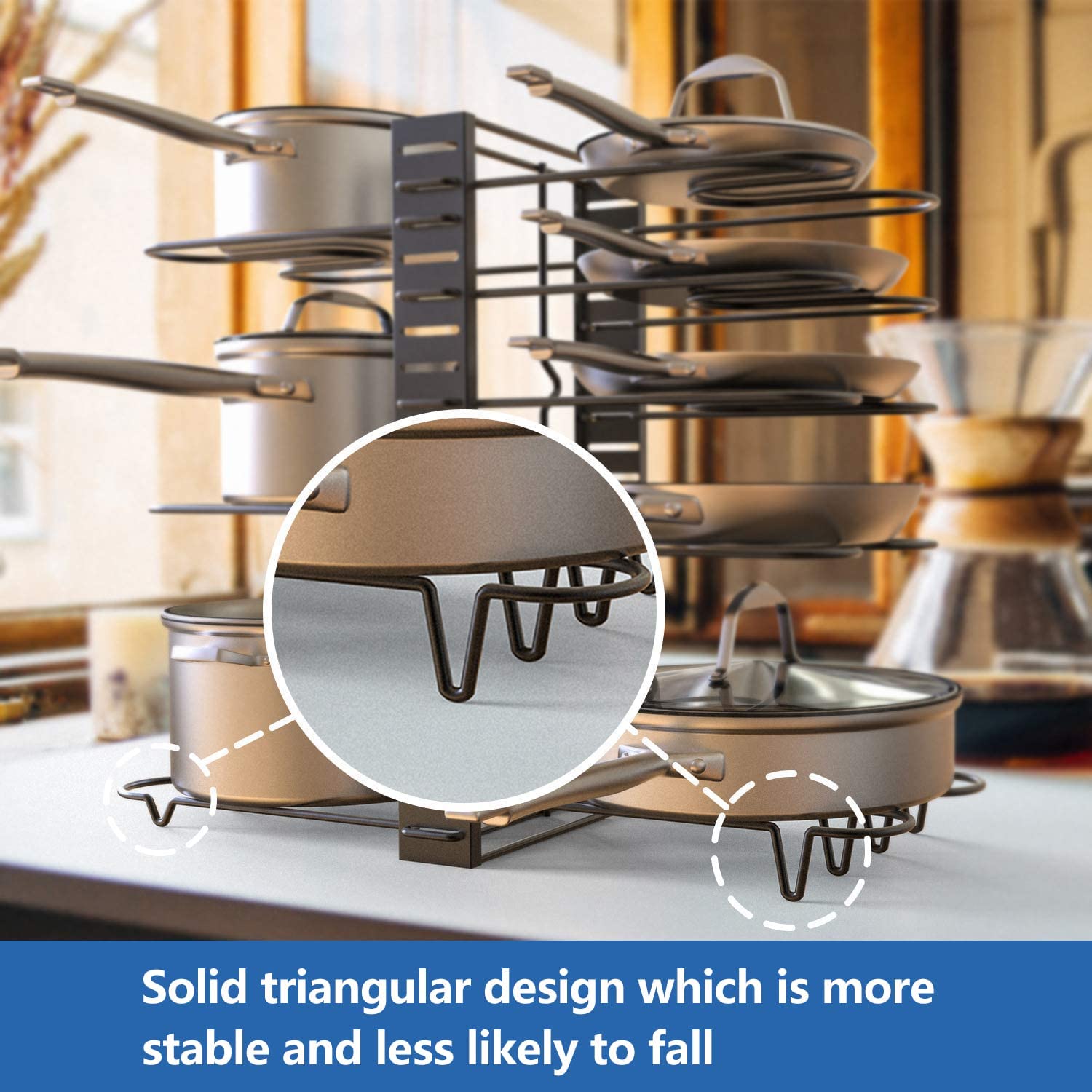 Transform your kitchen organization with the upgraded 8 Pots and Pans Holder Adjustable Organizer. This innovative storage solution is designed to maximize your kitchen space while providing easy access to your cookware. With its adjustable features, you can customize the height and position of the pot holders to fit your specific needs, making it an essential addition to any kitchen.