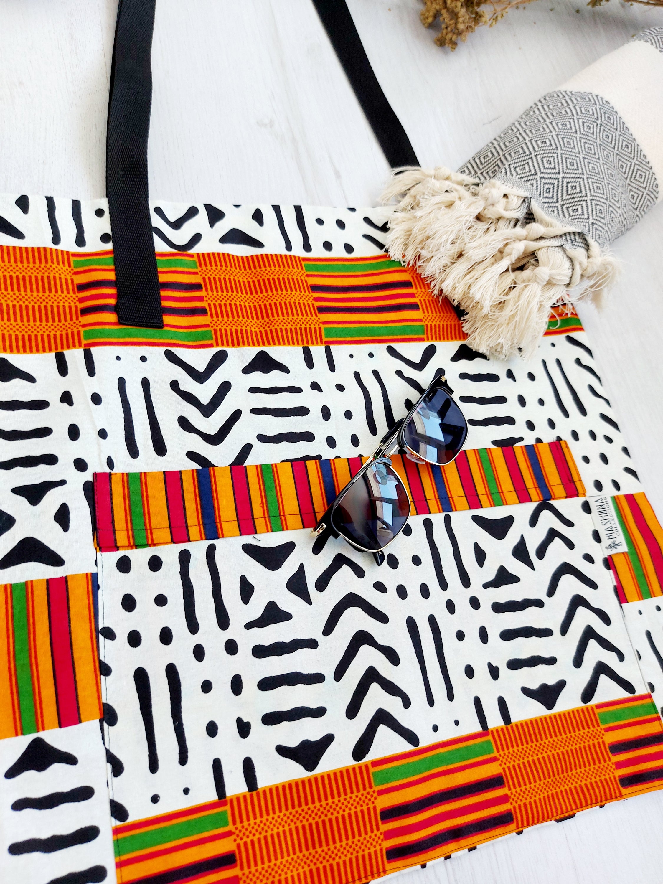 Introducing our stunning Handmade African Print Tote Bag, a versatile accessory that combines style, functionality, and eco-friendliness. Crafted from 100% quality cotton wax fabric, this tote bag is not only durable but also a sustainable alternative to plastic bags. Whether you're heading to the beach, going shopping, or simply running errands, this tote bag is designed to meet all your needs while making a fashionable statement.