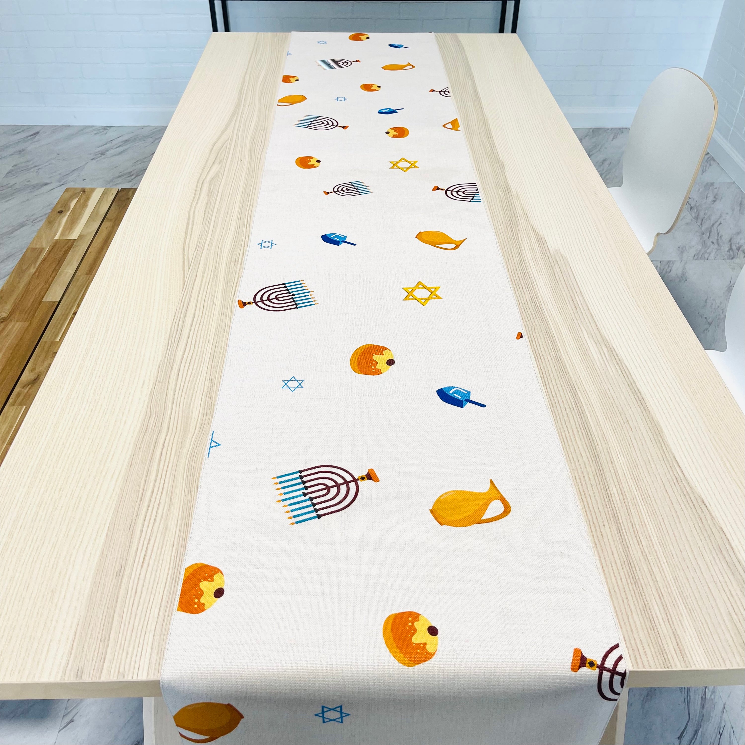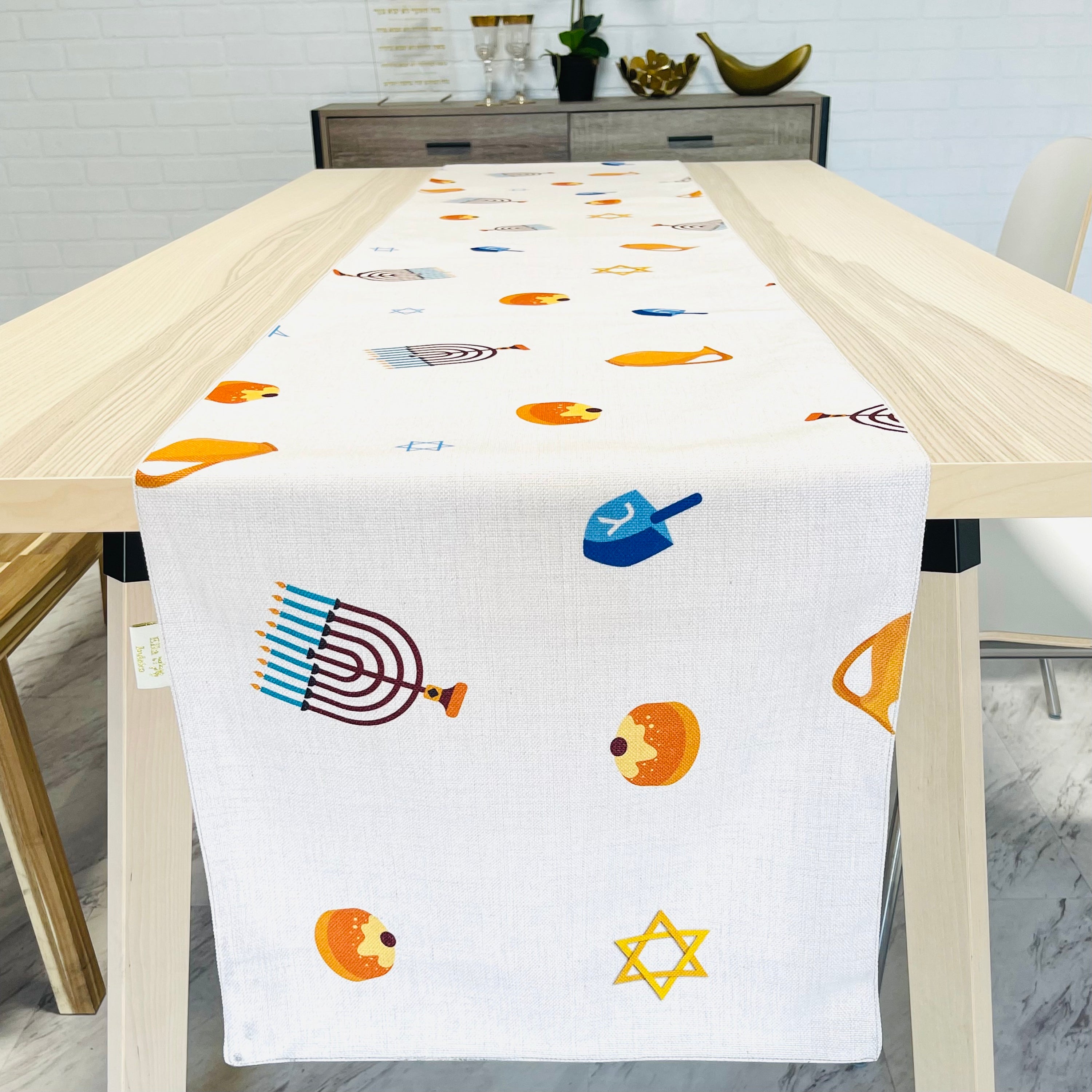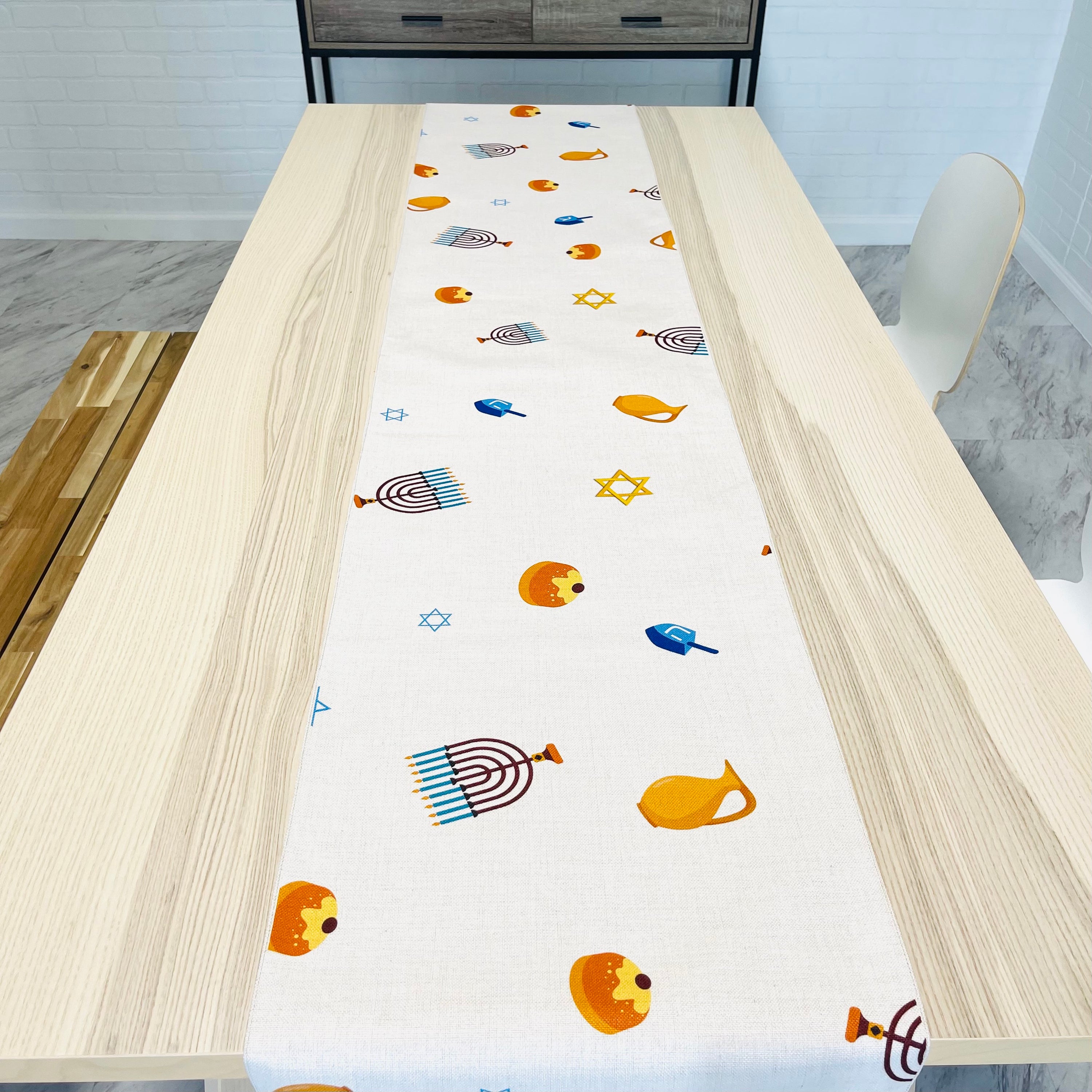 The Hanukkah Confetti Table Runner features a delightful array of scattered prints showcasing various Hanukkah symbols, including chanukiot (menorahs), sufganiyot (jelly donuts), oil cans, dreidels, and stars. Each symbol is thoughtfully placed to create a festive atmosphere that will impress your guests and enhance your holiday decor.