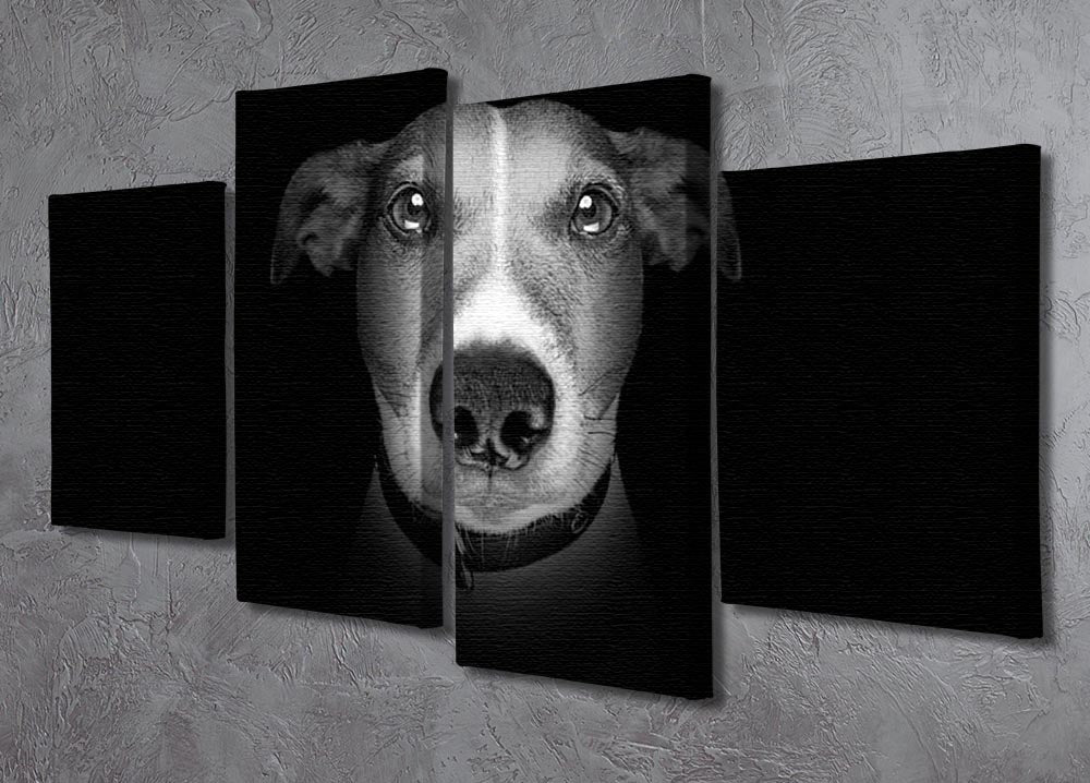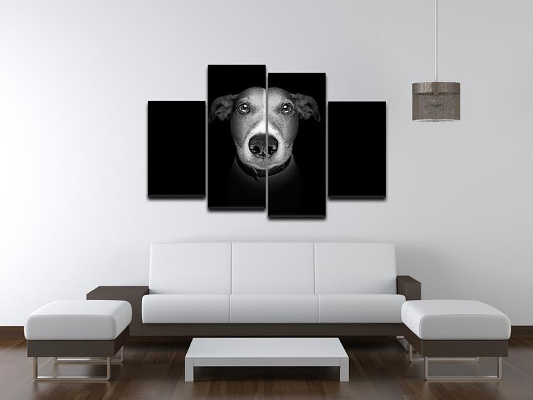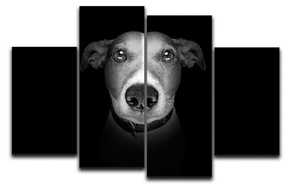 Transform your living space with our stunning Jack Russell Terrier dog isolated on a black dark background 4-split canvas artwork. This unique piece is designed to captivate dog lovers and art enthusiasts alike. The 4-split canvas format allows for a creative display that enhances the visual appeal of any room.