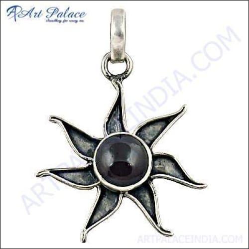 The Sun-Style Garnet Gemstone Silver Logo Pendant is a stunning piece of jewelry that combines elegance with a unique design. Crafted by Art Palace, Jaipur, a renowned manufacturer and exporter of exquisite jewelry since 1981, this pendant is a testament to the artistry and craftsmanship that goes into each piece. The pendant features a beautiful garnet gemstone, known for its rich red color and captivating brilliance, set in high-quality silver that enhances its overall aesthetic appeal.