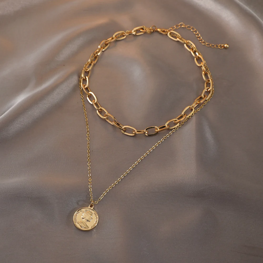 Introducing the Womens Layered Look Choker Necklace with Coin Pendant, a must-have accessory for every fashion-forward woman. This exquisite necklace combines elegance and modern style, making it the perfect addition to your jewelry collection. Crafted from high-quality alloy and finished in a stunning gold plating, this choker necklace is designed to stand out and complement any outfit.