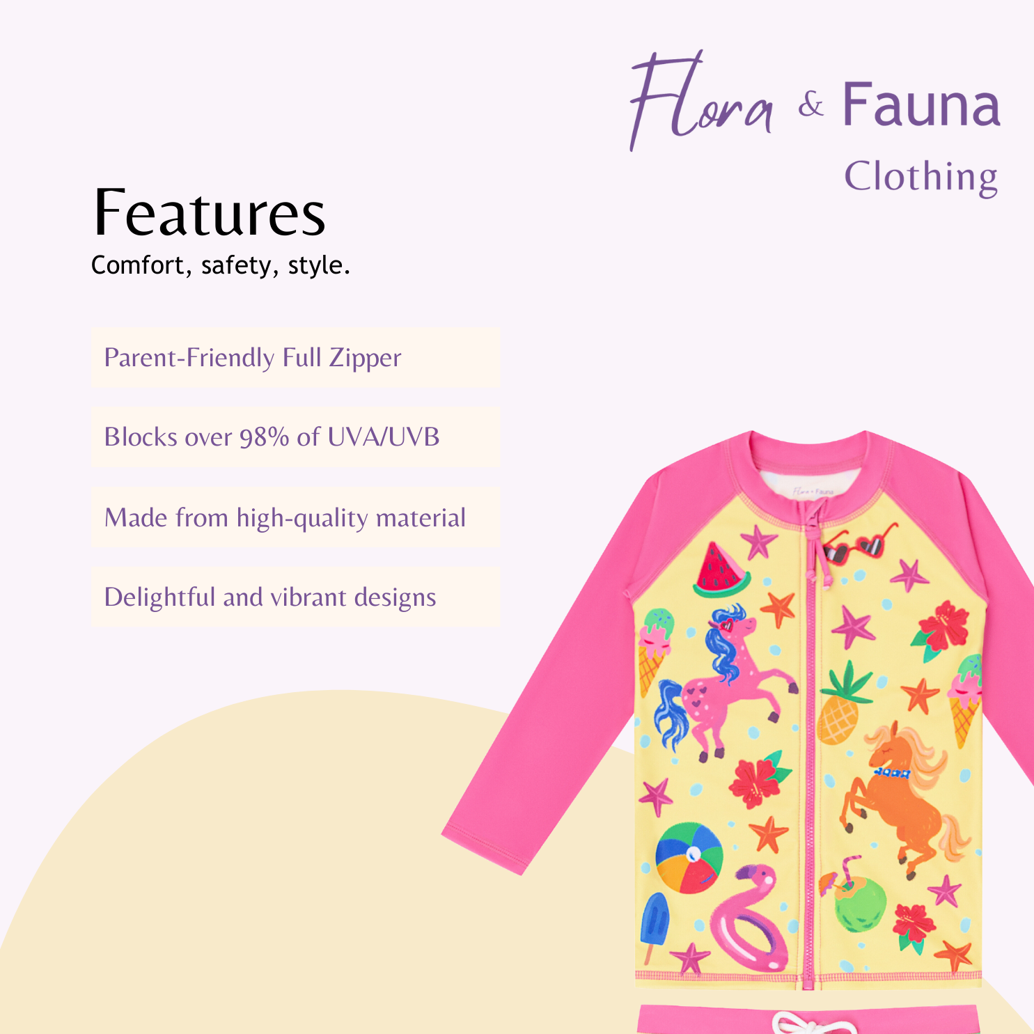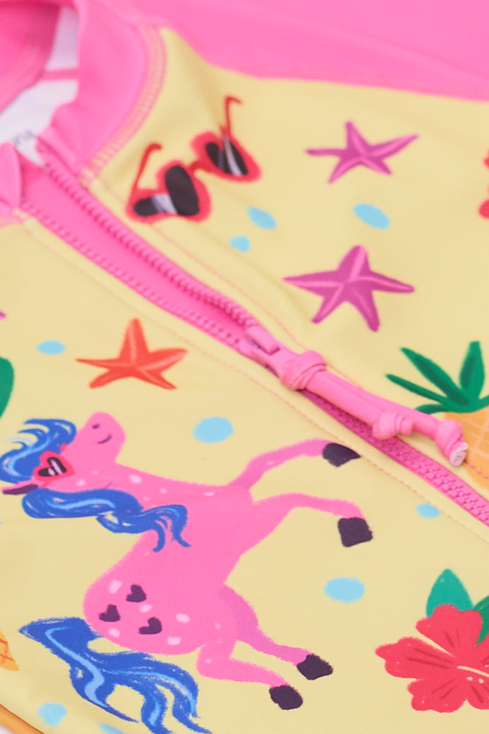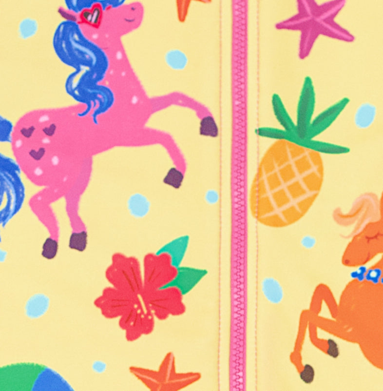 Introducing the 'Seaside Pony' 2-Piece Full Zip Rash Guard Swim Set, designed to keep your little one safe and stylish during their water adventures. This adorable swimsuit set is perfect for parents who prioritize safety, sun protection, and comfort for their children while ensuring they look cute and fashionable. With its vibrant designs featuring ponies, horses, and unicorns, your child will be the star of the beach or pool.