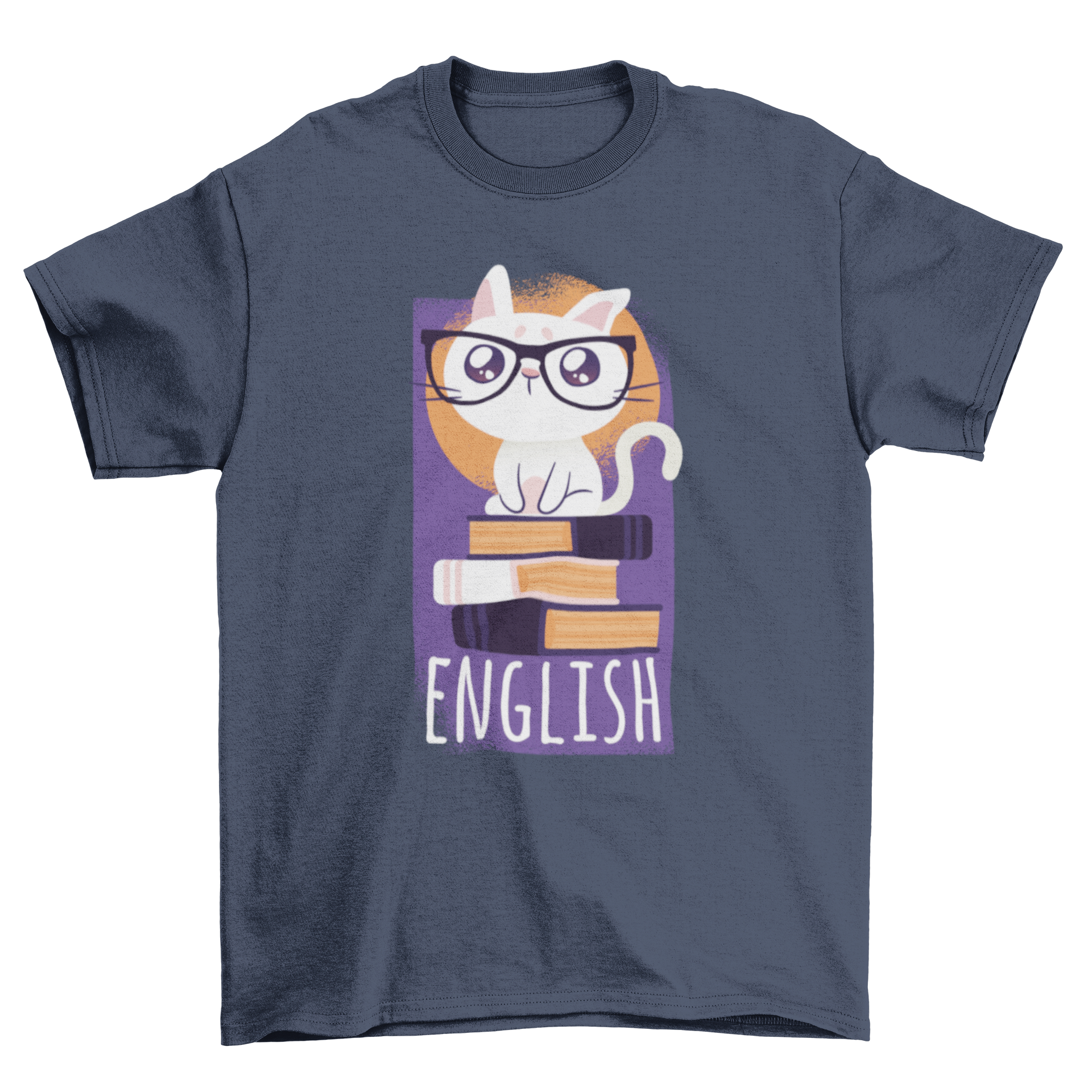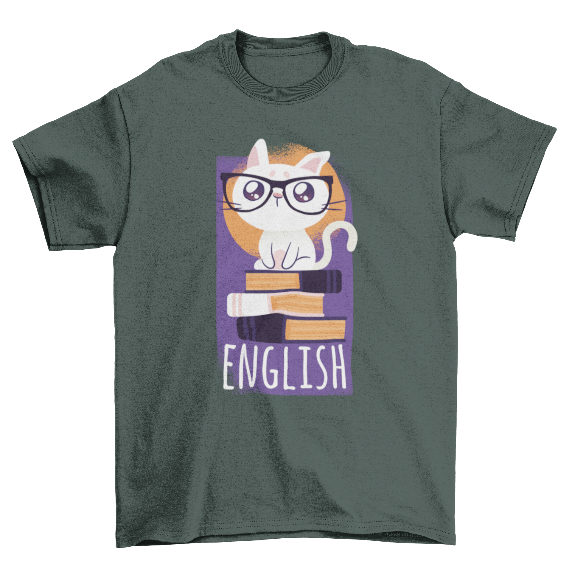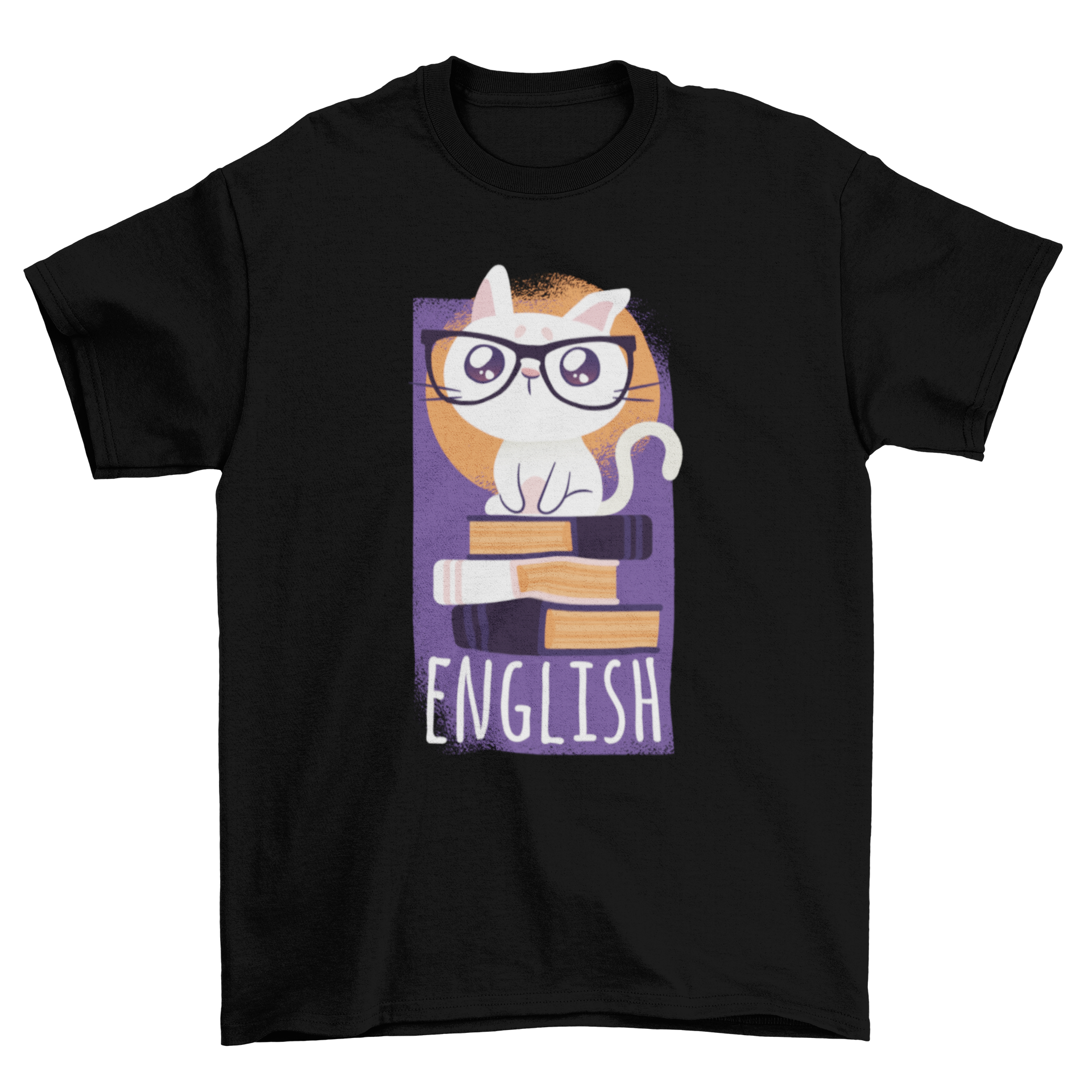 Introducing the Nerd Cat T-Shirt, a delightful addition to any cat lover's wardrobe. This unique t-shirt features an adorable nerdy cat surrounded by a big pile of English books, making it the perfect choice for those who appreciate both felines and literature. The playful design is complemented by the word 'English' prominently displayed, showcasing your passion for the subject in a fun and stylish way.
