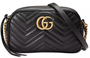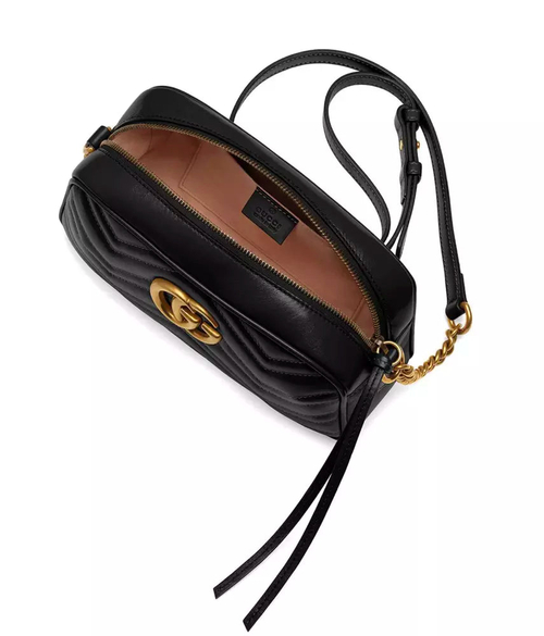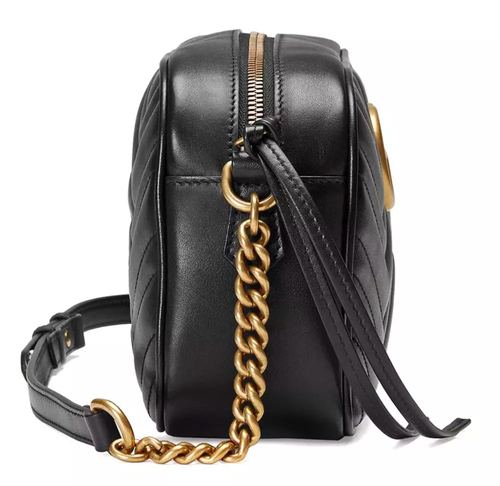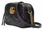 GG Marmont shoulder bag small size with structured chain design and top zipper closure finished with Double G. Chain shoulder strap features leather detail. Quilted leather pattern with chevron motif and GG on the back.