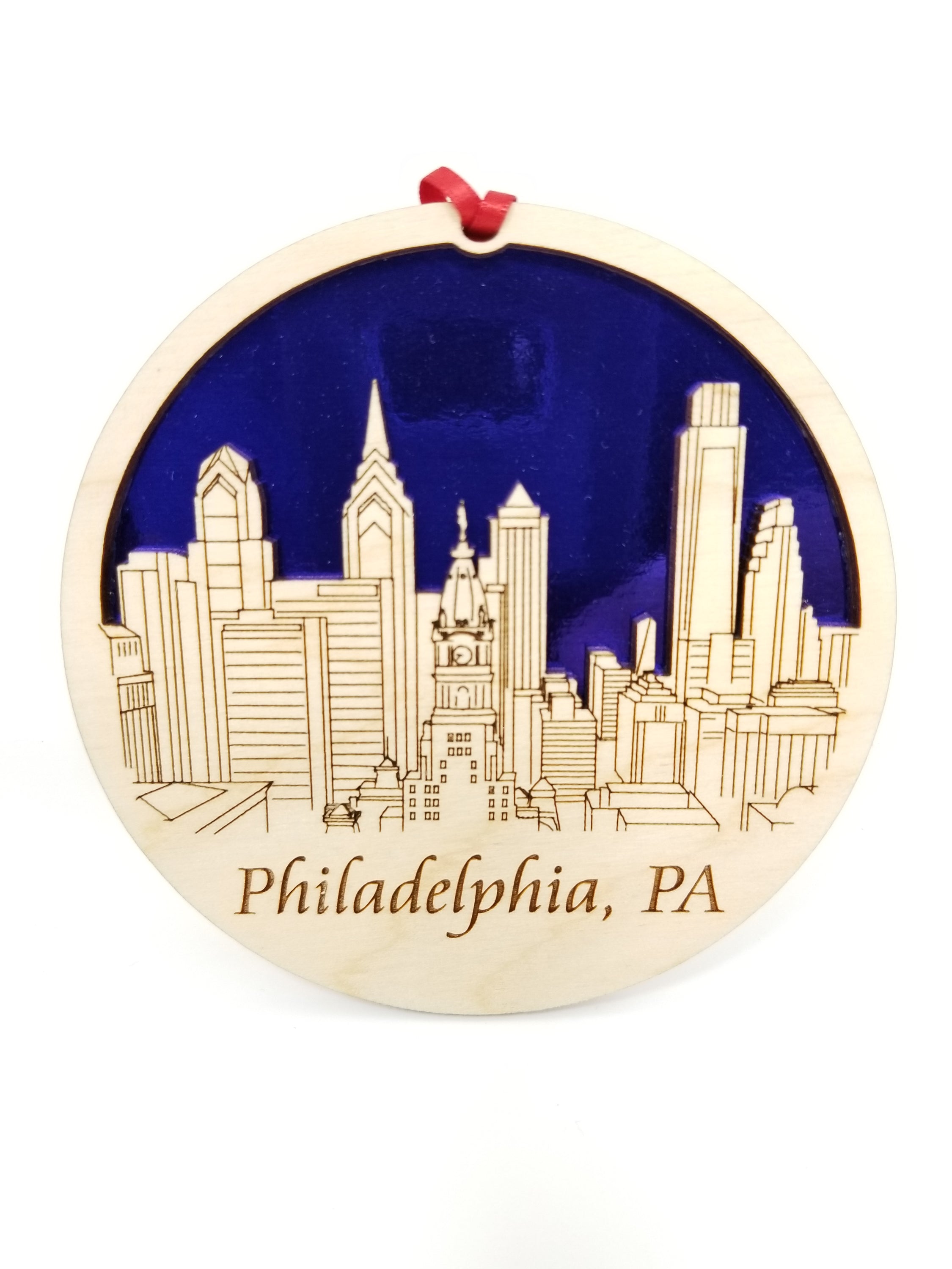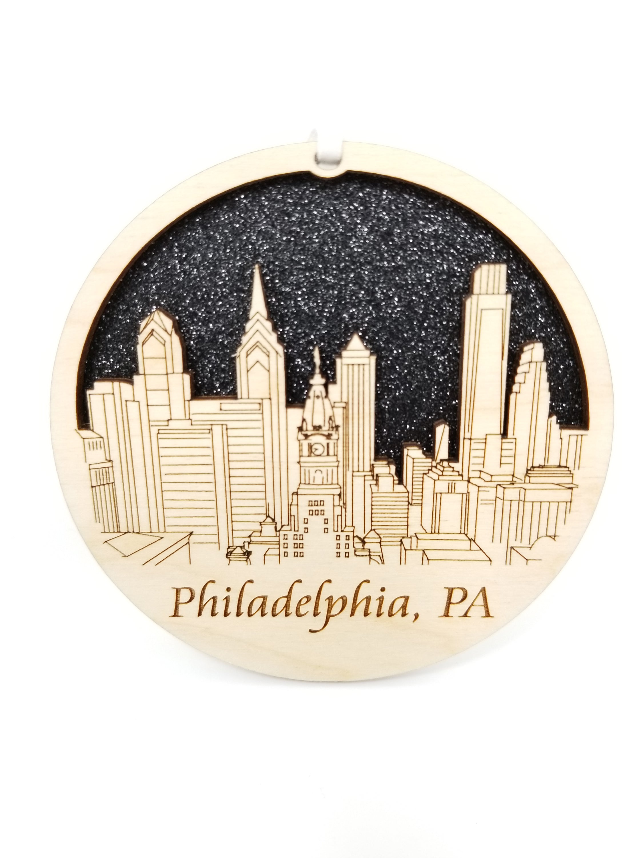 Each Philadelphia Skyline Ornament is meticulously cut from high-quality Baltic birch wood, ensuring durability and a beautiful finish. The natural grain of the wood adds a rustic charm, making it a standout piece on your Christmas tree or as part of your home decor. The ornament measures approximately 4 inches, making it the ideal size to hang on your tree or display in your home.