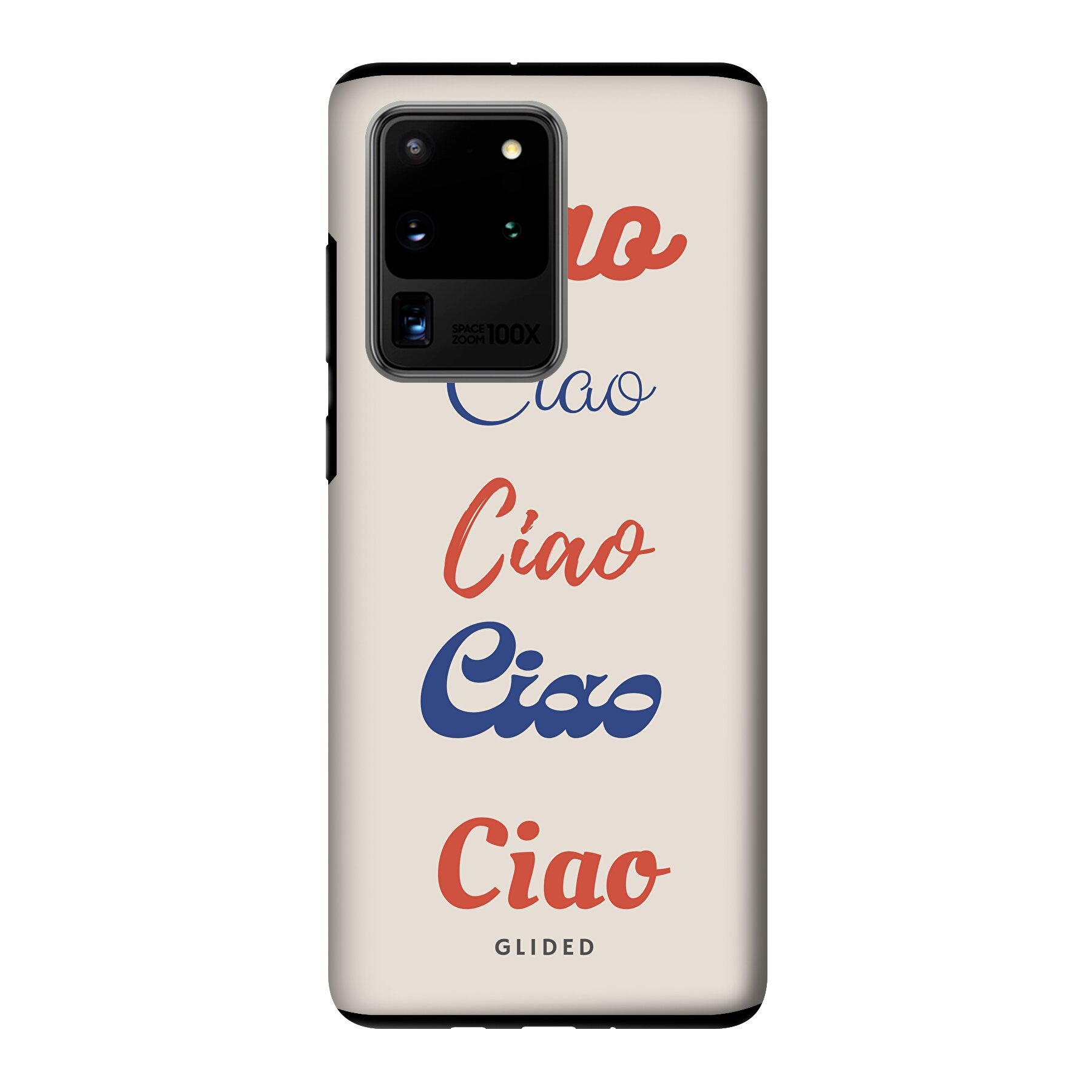 Willkommen zur Ciao Handyhülle für das Samsung Galaxy S20 Ultra und S20 Ultra 5G! Diese Hülle ist nicht nur ein praktischer Schutz für dein Smartphone, sondern auch ein stilvolles Accessoire, das die Lebensfreude und Herzlichkeit der italienischen Kultur verkörpert. Mit einem verspielten Hintergrund, auf dem das Wort "Ciao" in verschiedenen Schriftarten und Farben wiederholt wird, bringt diese Hülle einen Hauch von Italien in deinen Alltag.