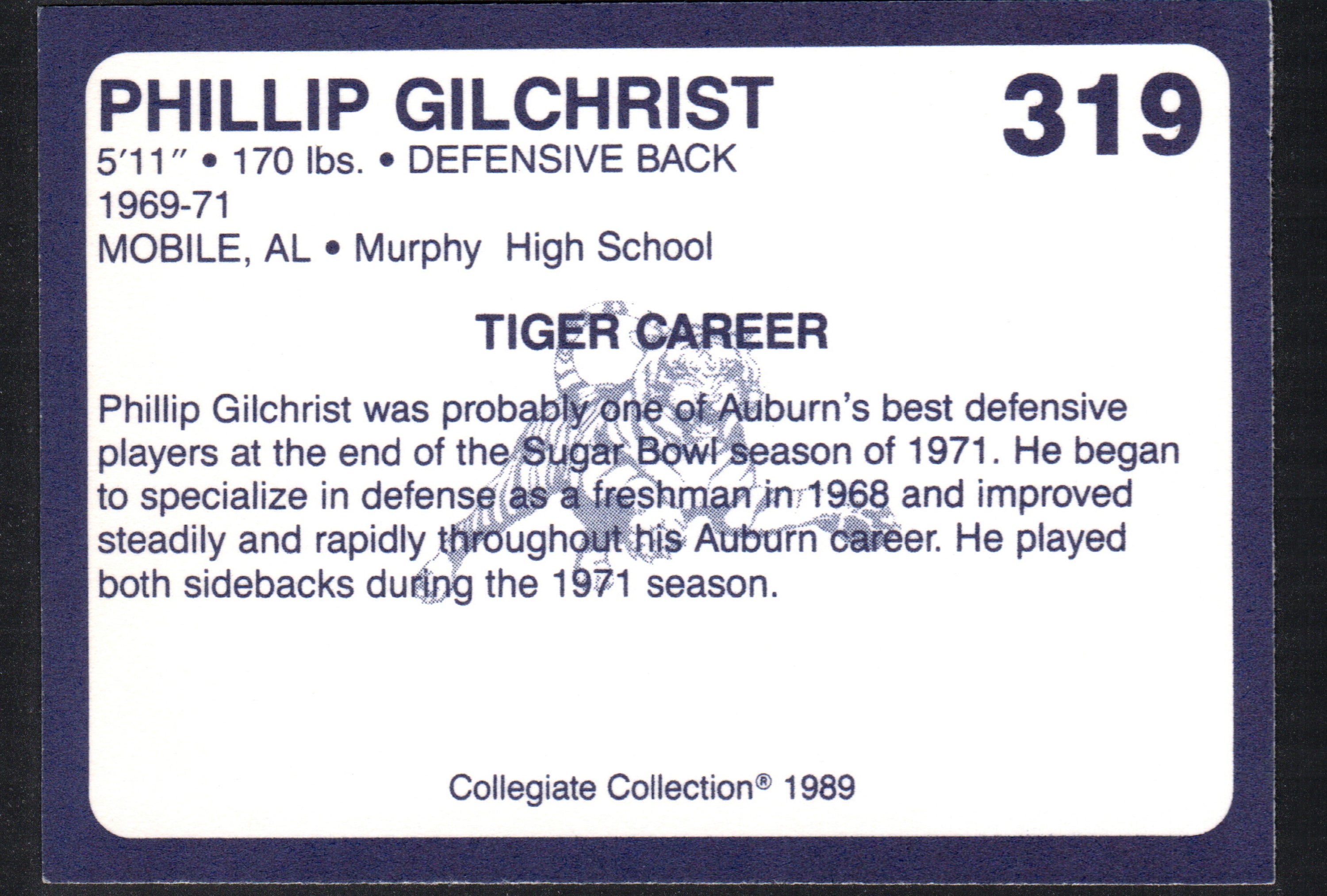 The Phillip Gilchrist Auburn Tigers #319 card from the 1989 Collegiate Collection is a remarkable piece of sports memorabilia that every Auburn Tigers fan and collector should consider adding to their collection. This card features Phillip Gilchrist, a notable former football player who played for the Auburn Tigers during the 1971 season. As part of the prestigious Collegiate Collection, this card not only represents a significant moment in college football history but also serves as a tribute to the legacy of the Auburn Tigers.