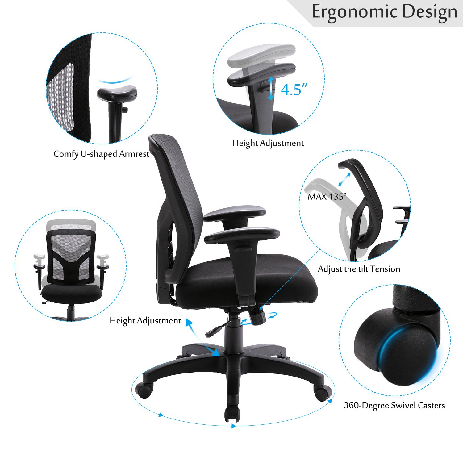 The Big Ergonomic Office Chair comes with a variety of features that enhance its usability and comfort. The chair is constructed with a breathable mesh back that allows for airflow, keeping you cool and comfortable throughout the day. The adjustable seat height ranges from 18.3 inches to 22 inches, accommodating users of different heights. Additionally, the chair has adjustable armrests that can be tailored to your preference, providing extra support for your arms and shoulders.