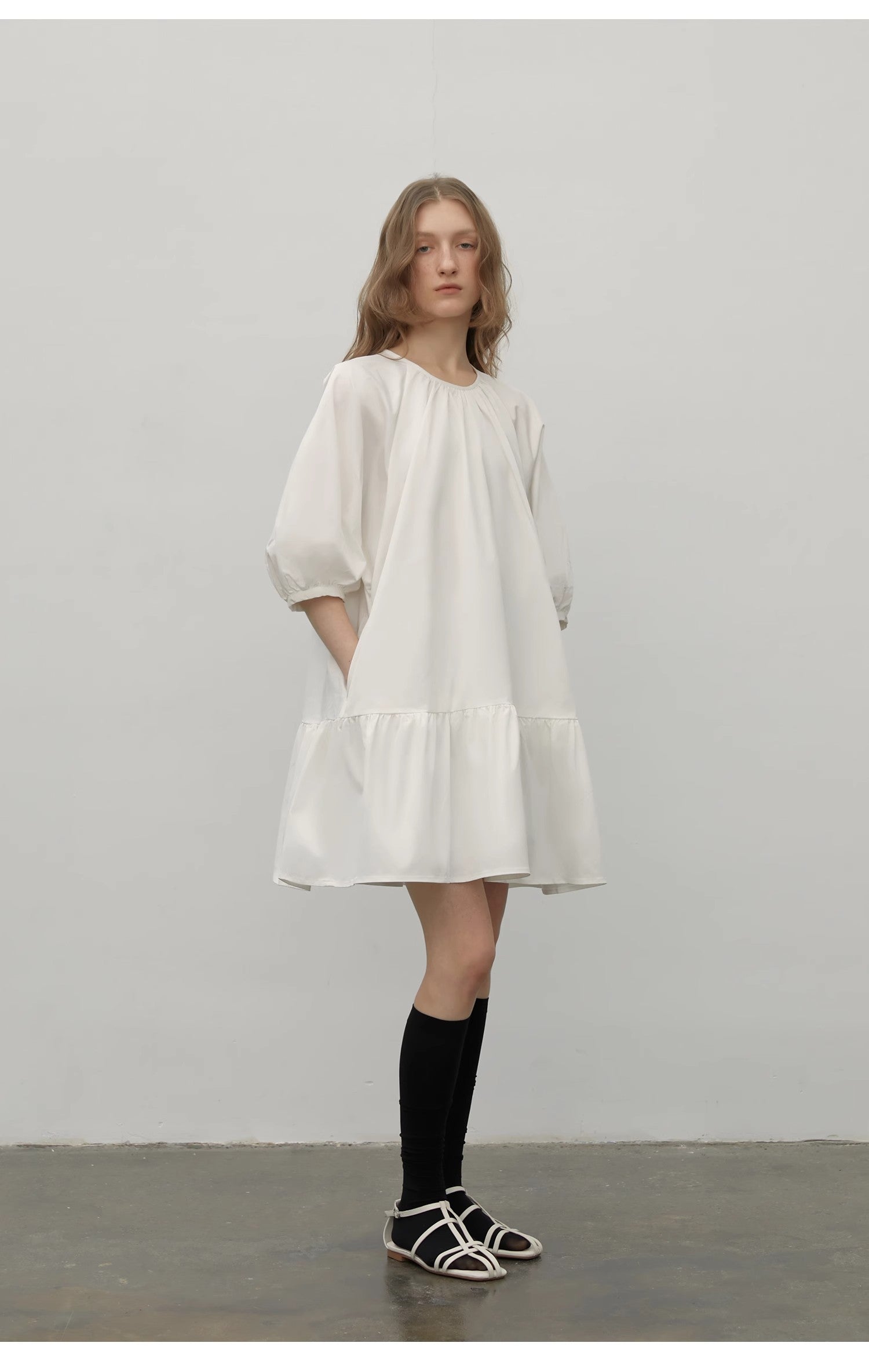 The dress is adorned with ripped pleats that enhance the hemline, creating a layered effect that is visually appealing. The flowing lines of the dress move beautifully with each step, ensuring that you make a statement wherever you go. The seven-point puff sleeves are another highlight, embracing the arms and injecting a sense of sweetness into the overall look. This simple yet effective design allows the charm of women's temperament to shine through, making it a must-have addition to your wardrobe.