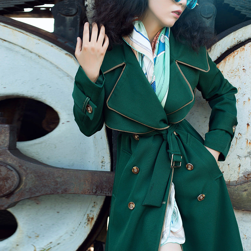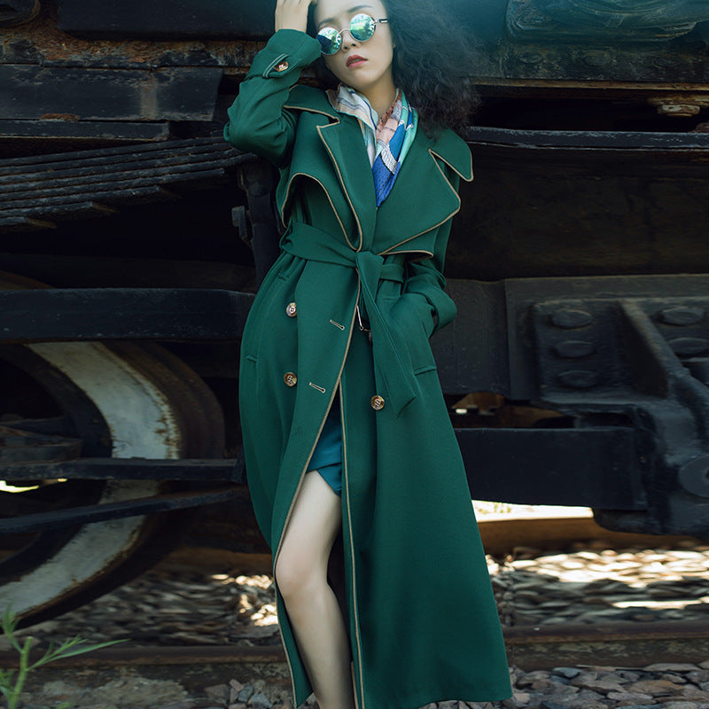 Introducing the Long Coat Temperament British Style Double Breasted, a stunning piece that combines traditional British elegance with modern flair. This full-length trench coat is designed to make a statement, featuring a sophisticated double-breasted front that adds a touch of refinement to any outfit. The deep green tone is not only eye-catching but also versatile, allowing you to elevate your street style effortlessly.