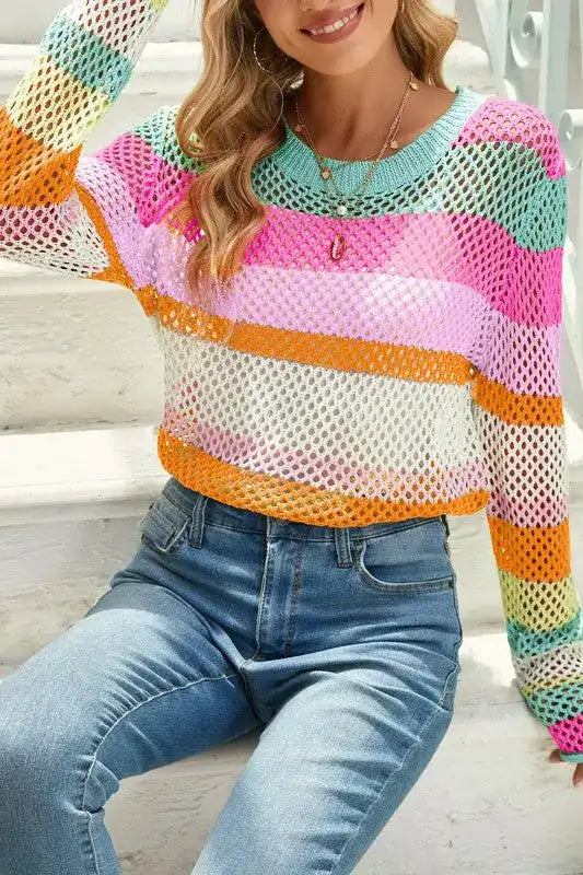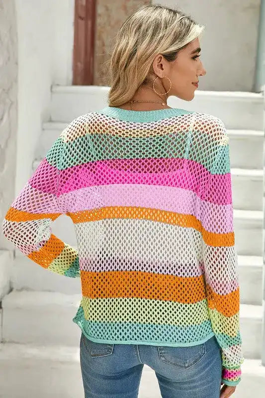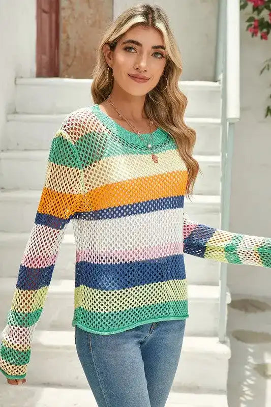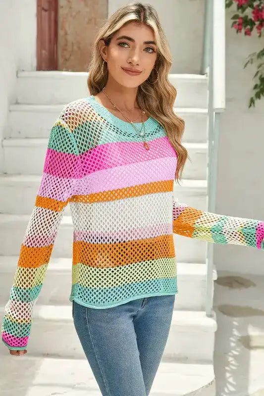 Whether it’s spring, summer, fall, or winter, the Colorblock Striped Hollow Knitted Top is a year-round staple. In warmer months, wear it alone with shorts or a flowy skirt. As the temperature drops, layer it under a stylish jacket or over a long-sleeve shirt for added warmth without sacrificing style. This adaptability makes it a smart investment for your wardrobe.