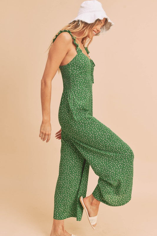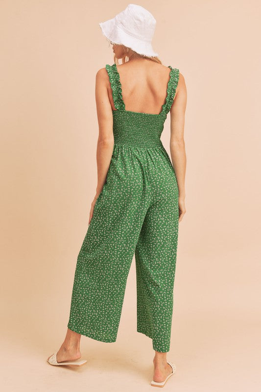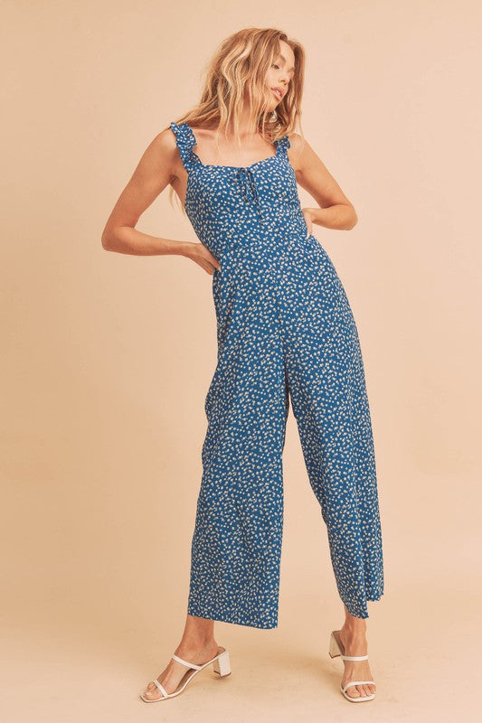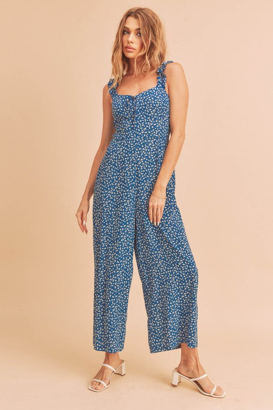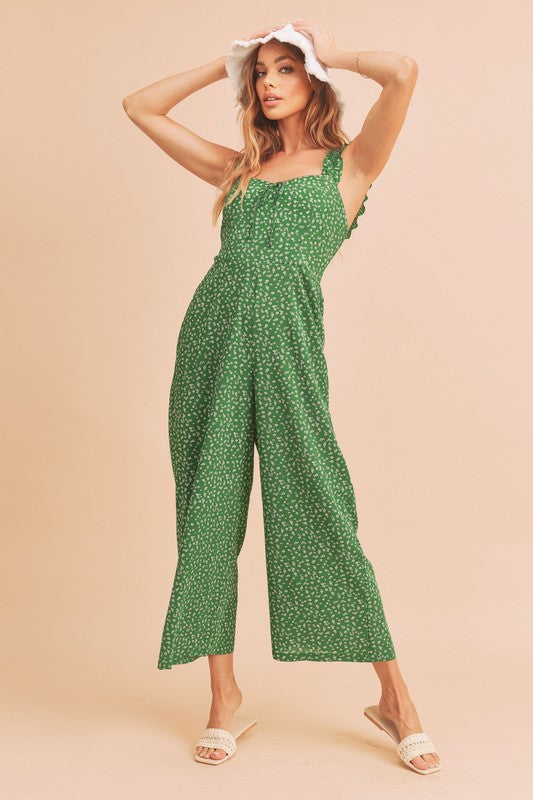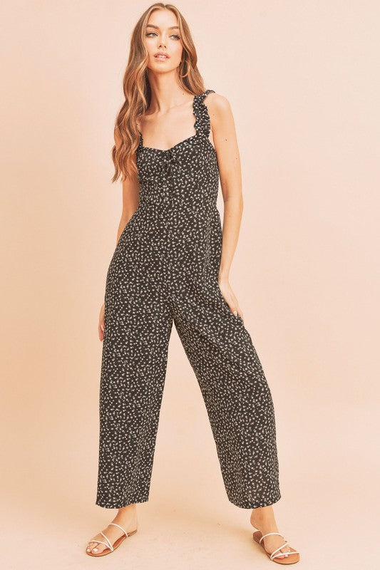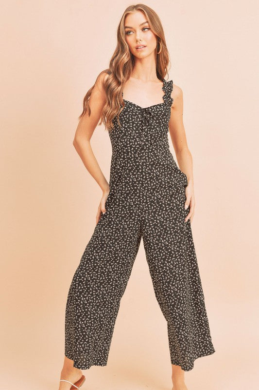 The playful ruffle trim along the neckline and straps enhances the overall aesthetic of the Sadie Jumpsuit, giving it a fun and flirty vibe. This design element not only adds visual interest but also frames your face beautifully, making it a perfect choice for both casual outings and more formal events. Whether you're attending a garden party, a brunch with friends, or a romantic dinner, this jumpsuit is versatile enough to suit any occasion.