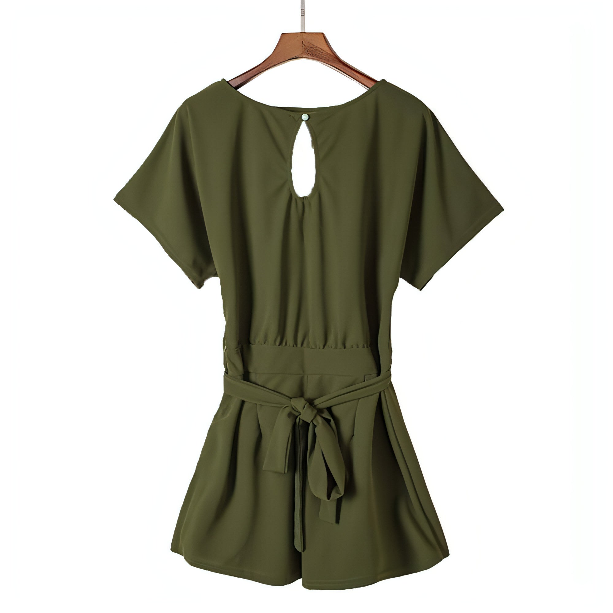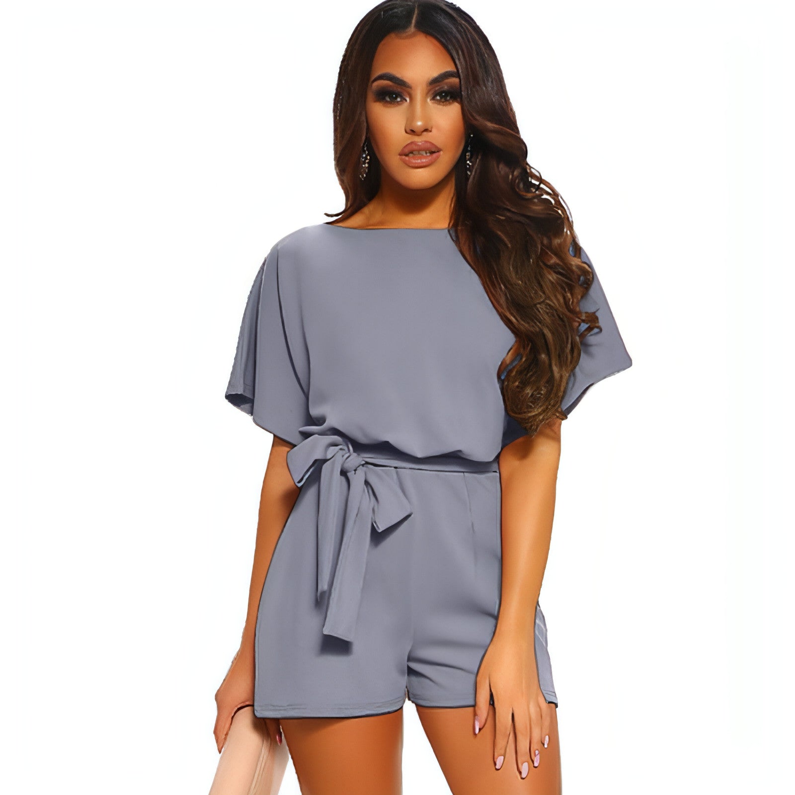 Introducing the Women's Round Neck Short-sleeved Lace-up Jumpsuit - a must-have addition to your wardrobe that combines style, comfort, and versatility. This jumpsuit is designed for the modern woman who values both fashion and functionality. Whether you're heading to a casual brunch, a day at the office, or a night out with friends, this jumpsuit is the perfect choice.