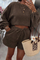 Introducing the Solid Textured Knit Pullover and Shorts Set, a perfect blend of style and comfort that caters to your laid-back lifestyle. This dark brown two-piece set is designed to keep you cozy while ensuring you look effortlessly chic. Crafted from a high-quality blend of polyester and spandex, the textured knit fabric not only feels luxurious against your skin but is also breathable and durable, making it an ideal choice for year-round wear.