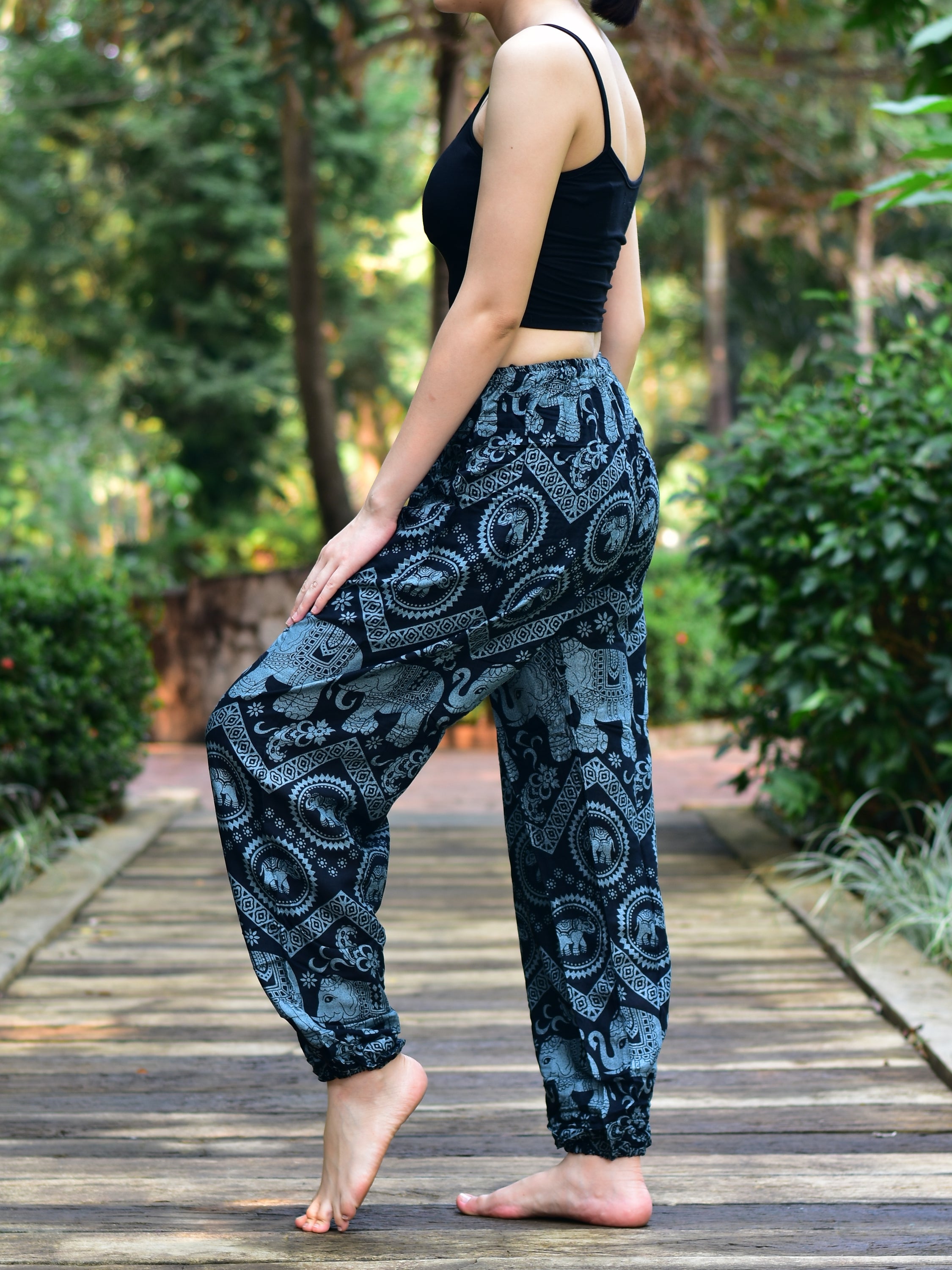 Introducing the Bohotusk Black Elephant Tusker Print Women's Harem Pants, a perfect blend of comfort, style, and social responsibility. These beautifully crafted trousers are handmade in Thailand from 100% Super Soft Rayon material, ensuring a lightweight yet strong and resilient garment. Designed for versatility, these harem pants are ideal for various activities, from yoga and pilates to casual outings and music festivals.