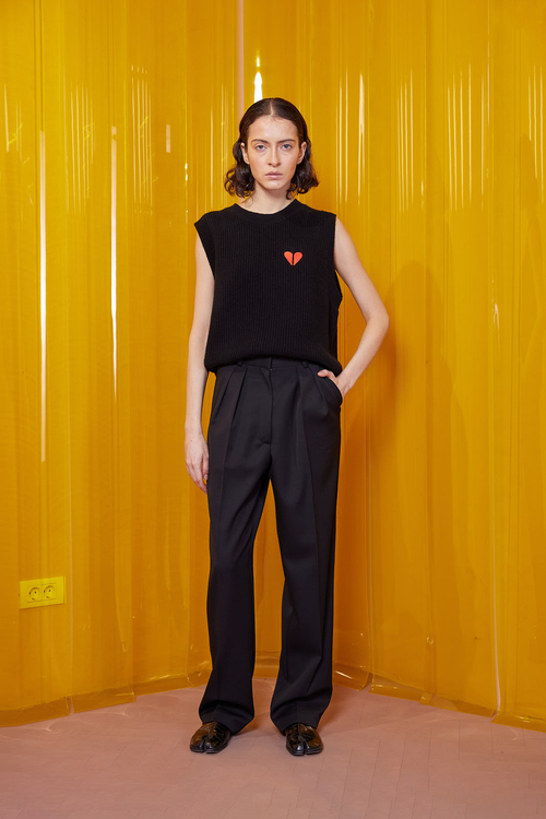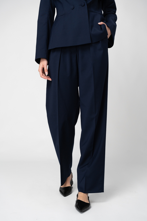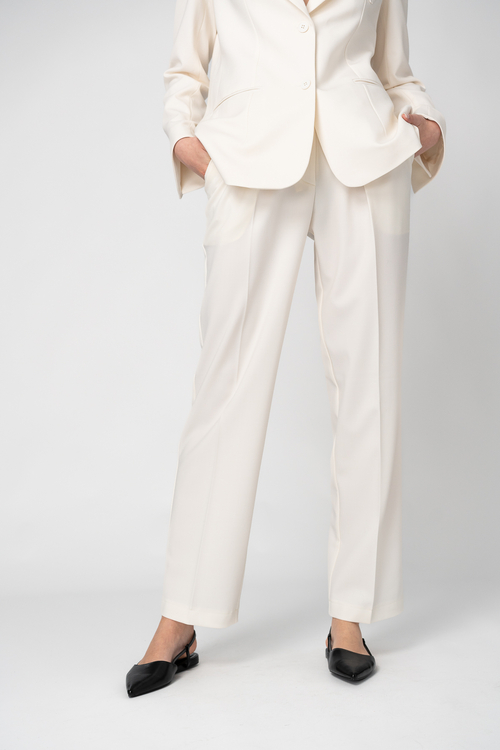 Wool fabric trousers, with a straight cut and folds on the upper side. The pants have two side pockets.