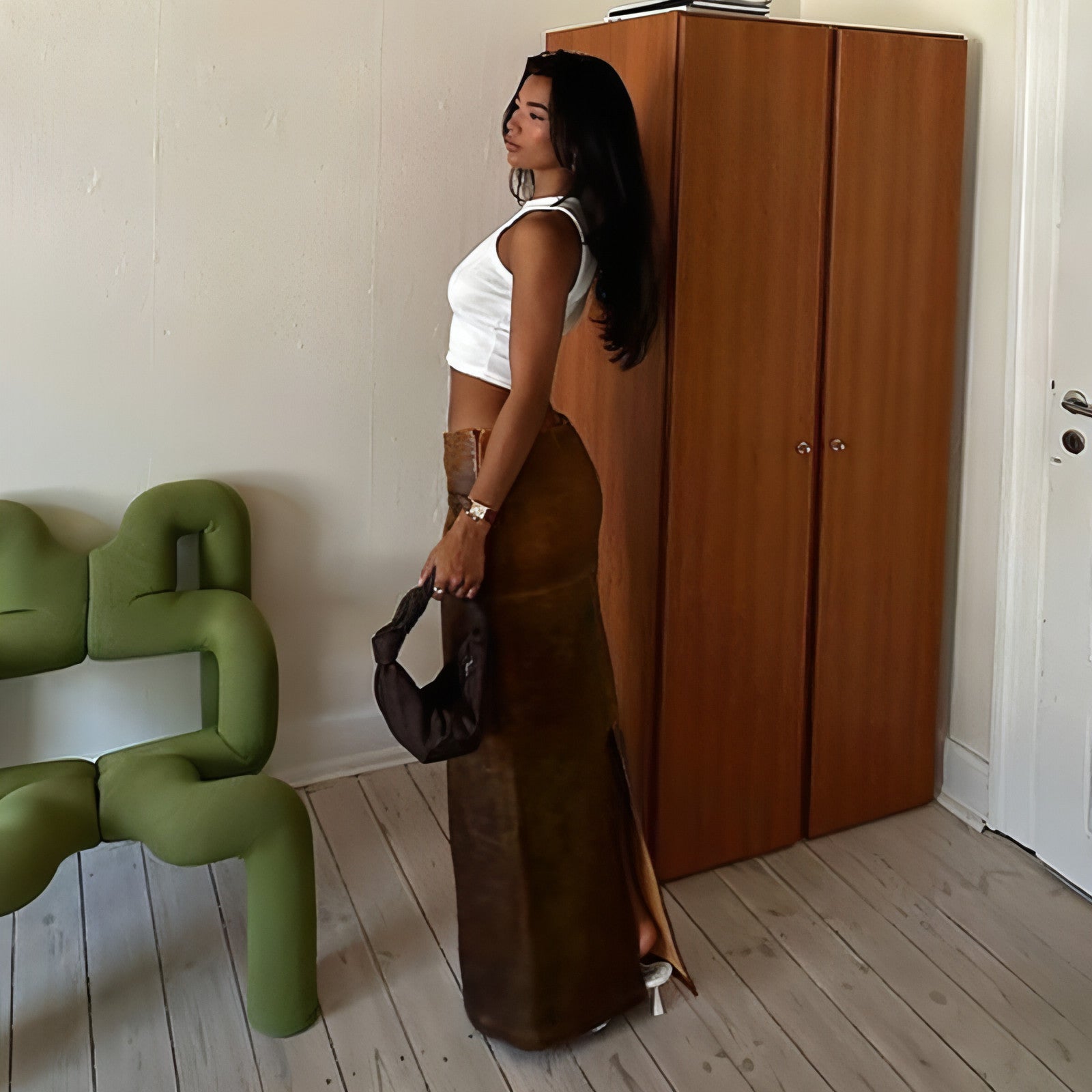 The Retro Style Distressed Leather Skirt boasts several key features that make it a must-have in your wardrobe: