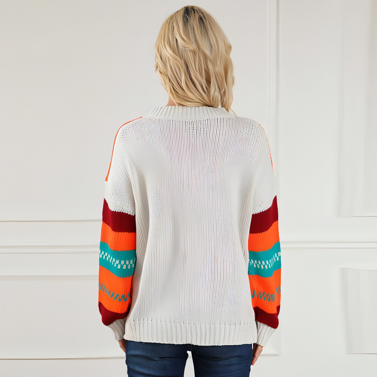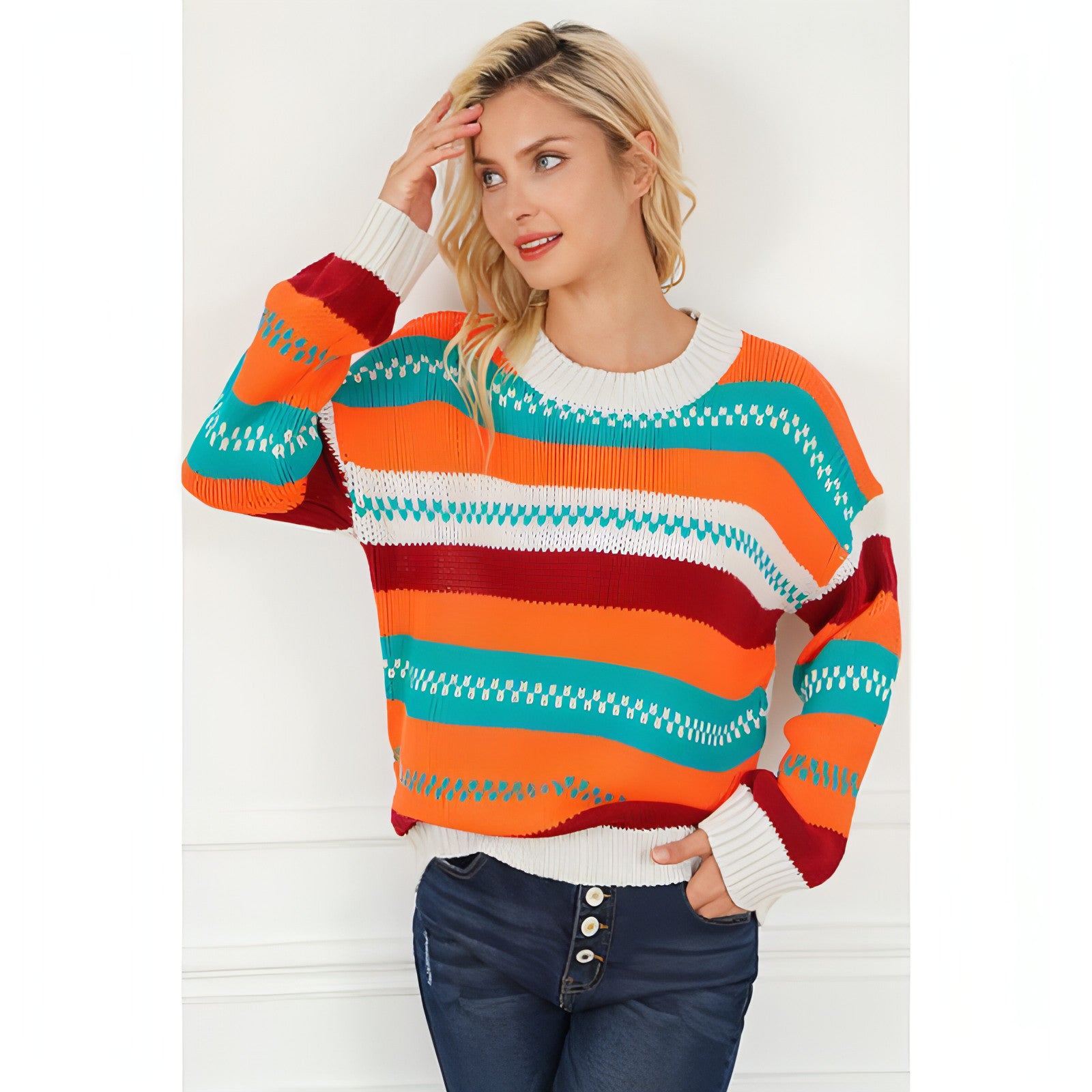 To keep your Loose Color Pullover Regular Sleeve Sweater looking its best, we recommend machine washing it in cold water and tumble drying on low. Avoid using bleach or fabric softeners to maintain the integrity of the fabric and colors. With proper care, this sweater will remain a favorite in your collection for years to come.