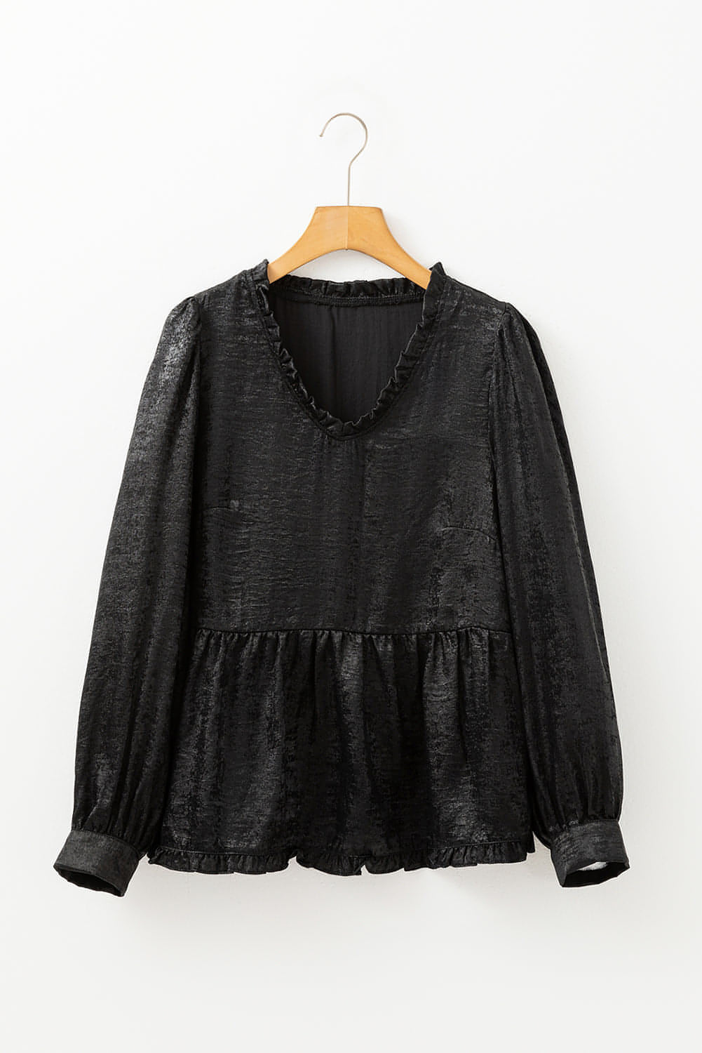 The Black Metallic Frilled V Neck Puff Sleeve Babydoll Blouse is not just another piece of clothing; it is an investment in your style. Its unique design and high-quality materials make it a versatile addition to your wardrobe that can be worn for various occasions. Whether you're attending a party, going out for dinner, or simply want to look fabulous on a casual day, this blouse has got you covered. Don't miss out on the opportunity to own this statement-making piece that combines comfort, style, and elegance.
