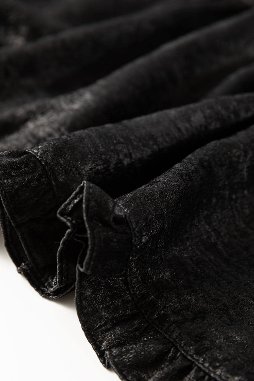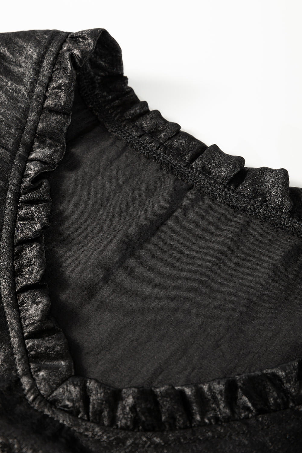 Styling the Black Metallic Frilled Blouse is easy and fun. Pair it with high-waisted jeans for a casual yet chic look, or tuck it into a sleek pencil skirt for a more polished appearance. For a night out, consider wearing it with a leather mini skirt and ankle boots to create an edgy ensemble. Accessorize with statement earrings or a bold necklace to complete your outfit and draw attention to the blouse's unique features.