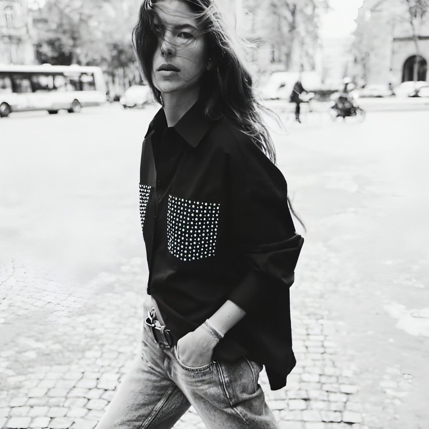 The standout feature of this shirt is its eye-catching rivet ornaments. These unique details add a trendy touch that sets this shirt apart from standard styles, making it a must-have for any fashion-forward wardrobe. The rivets are strategically placed to enhance the overall aesthetic without overwhelming the design, ensuring you look chic and stylish.