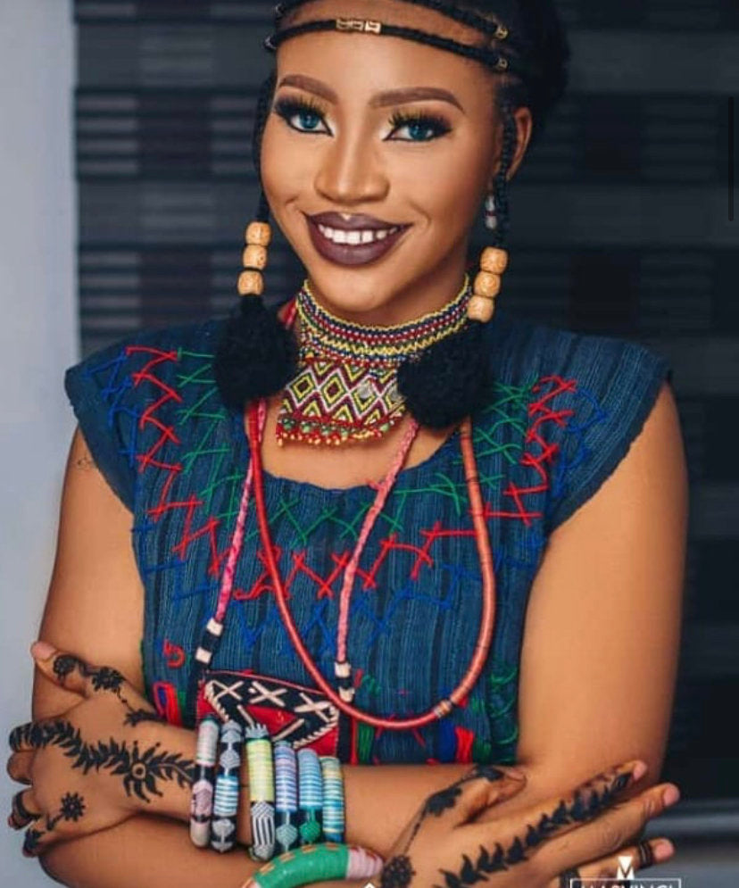 This costume comes with a range of accessories that enhance its overall appeal. The Jigida waist beads are a traditional adornment that adds a touch of elegance and femininity to the outfit. These beads are not only beautiful but also carry cultural significance, often symbolizing beauty, fertility, and femininity in Fulani culture.
